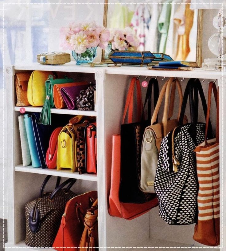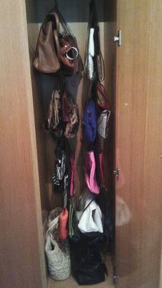 Si demás tienes un armario sin cajonera, puedes guardar los bolsos en organizarores transparentes, que se cuelgan como una percha. O en una estantería. Así los tendrás todos a la vista: