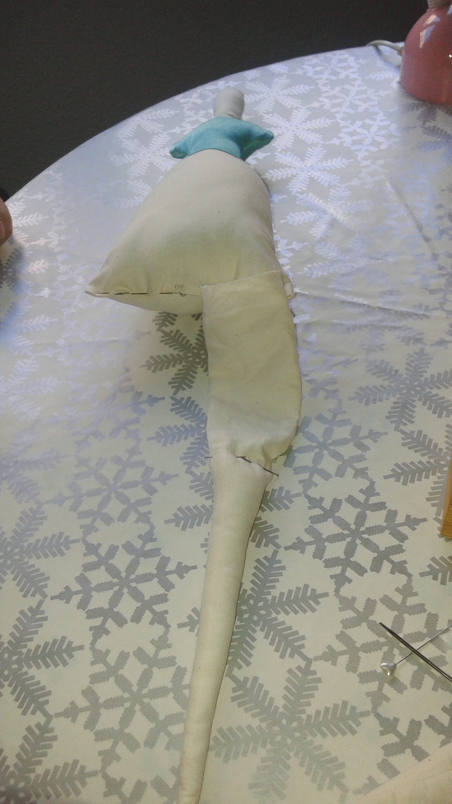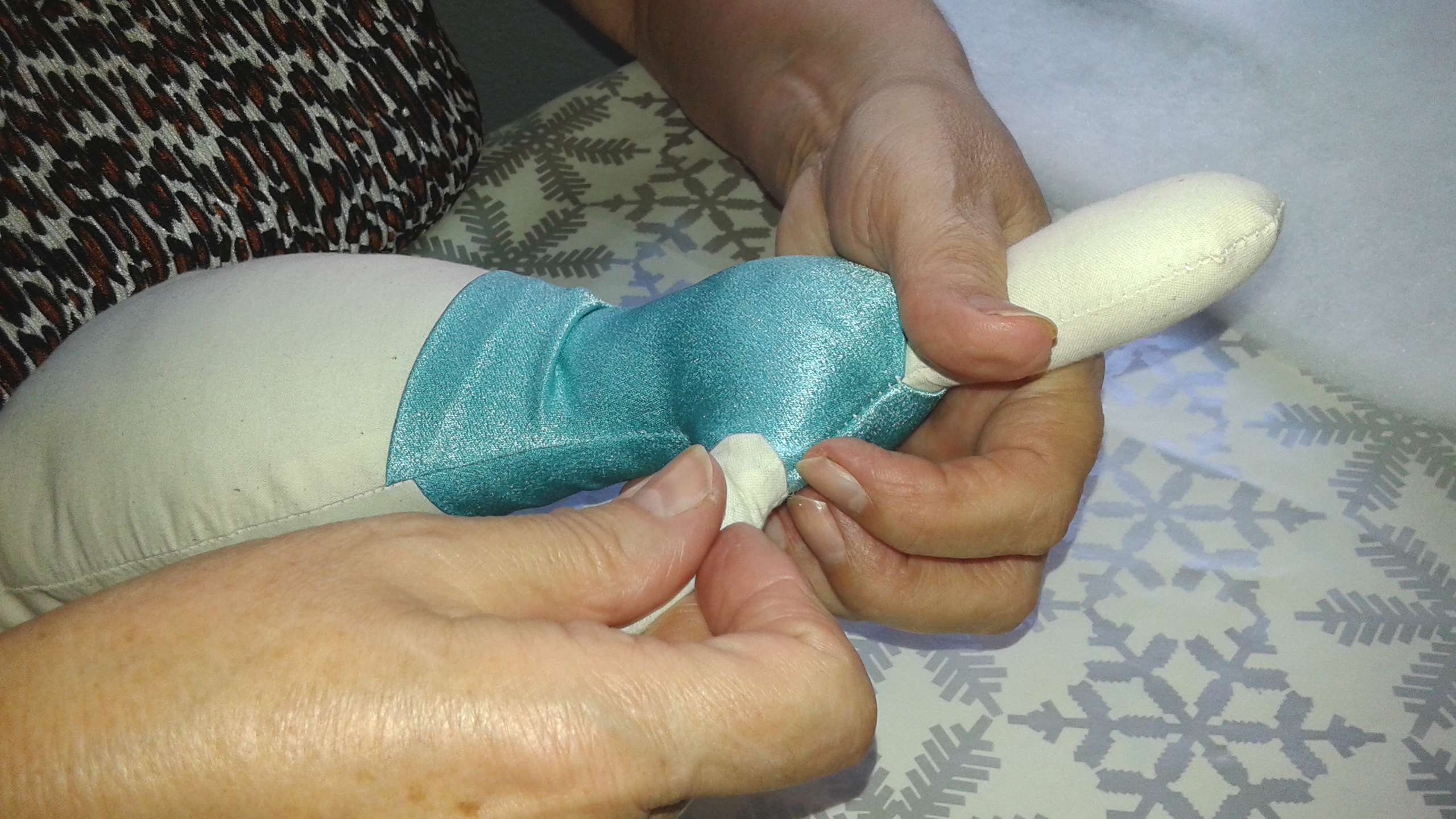 Cerraremos la costura a modo de bolsita para ir introduciendo la “guata”. En este paso es donde debemos tener mucha paciencia. Sobre todo en las manos y los pies, que es donde se estrecha y será más difícil introducirla. Podemos ayudarnos con una aguja de punto.