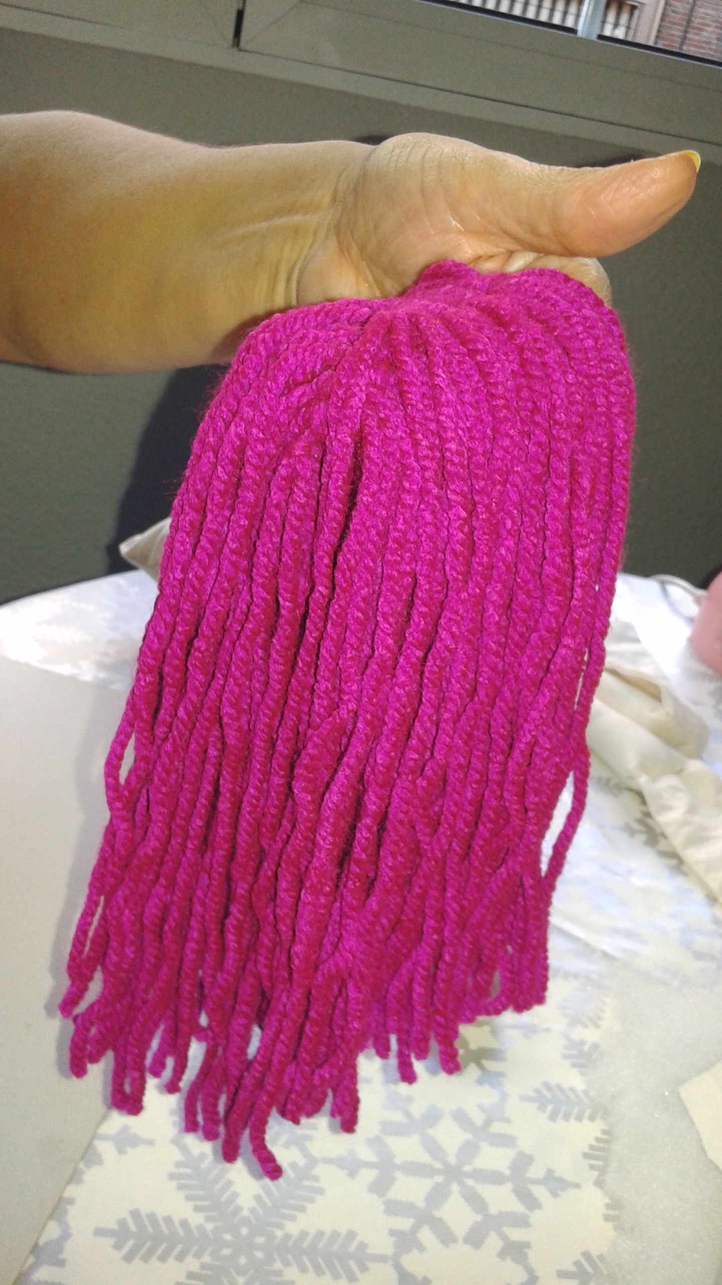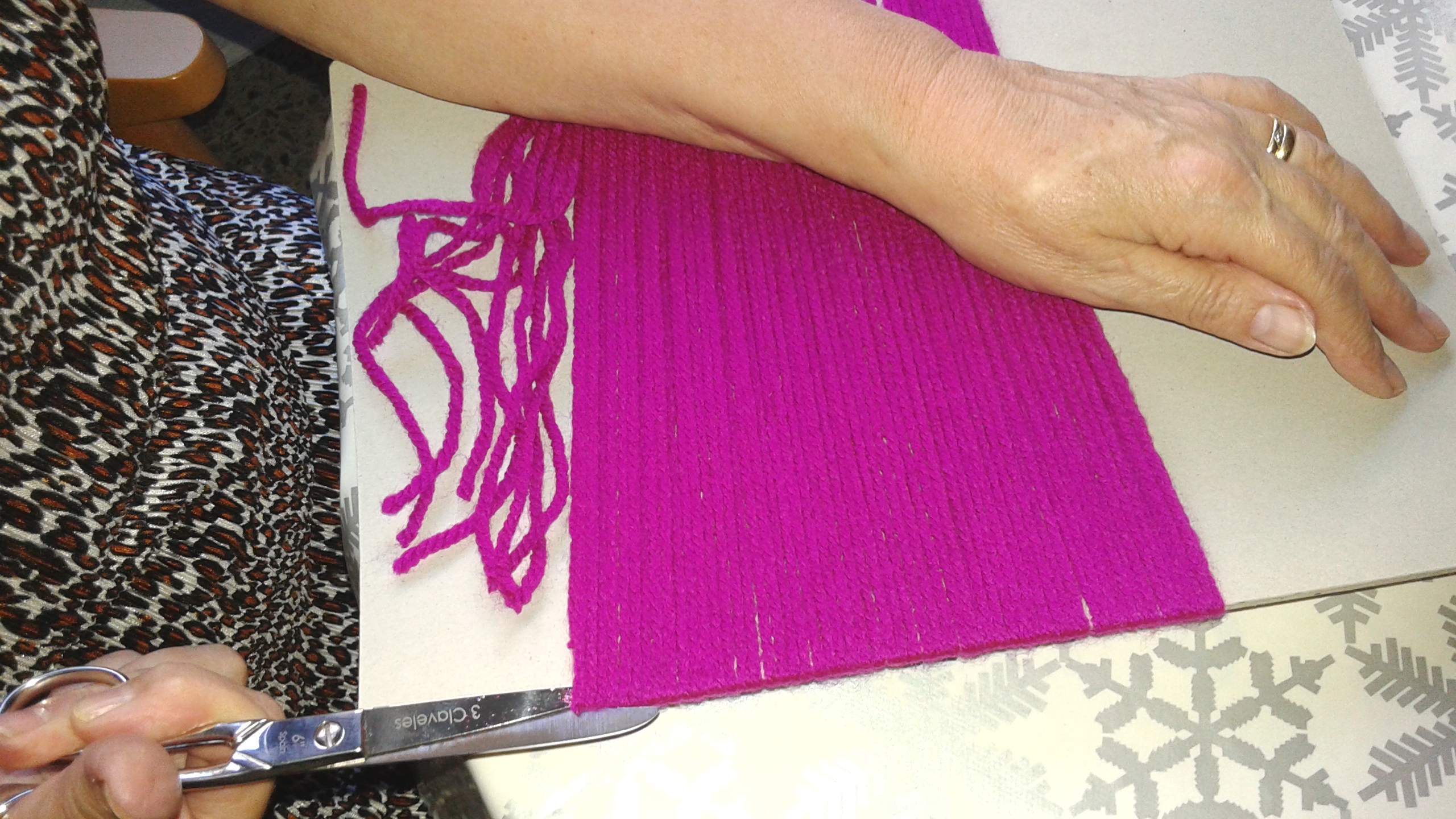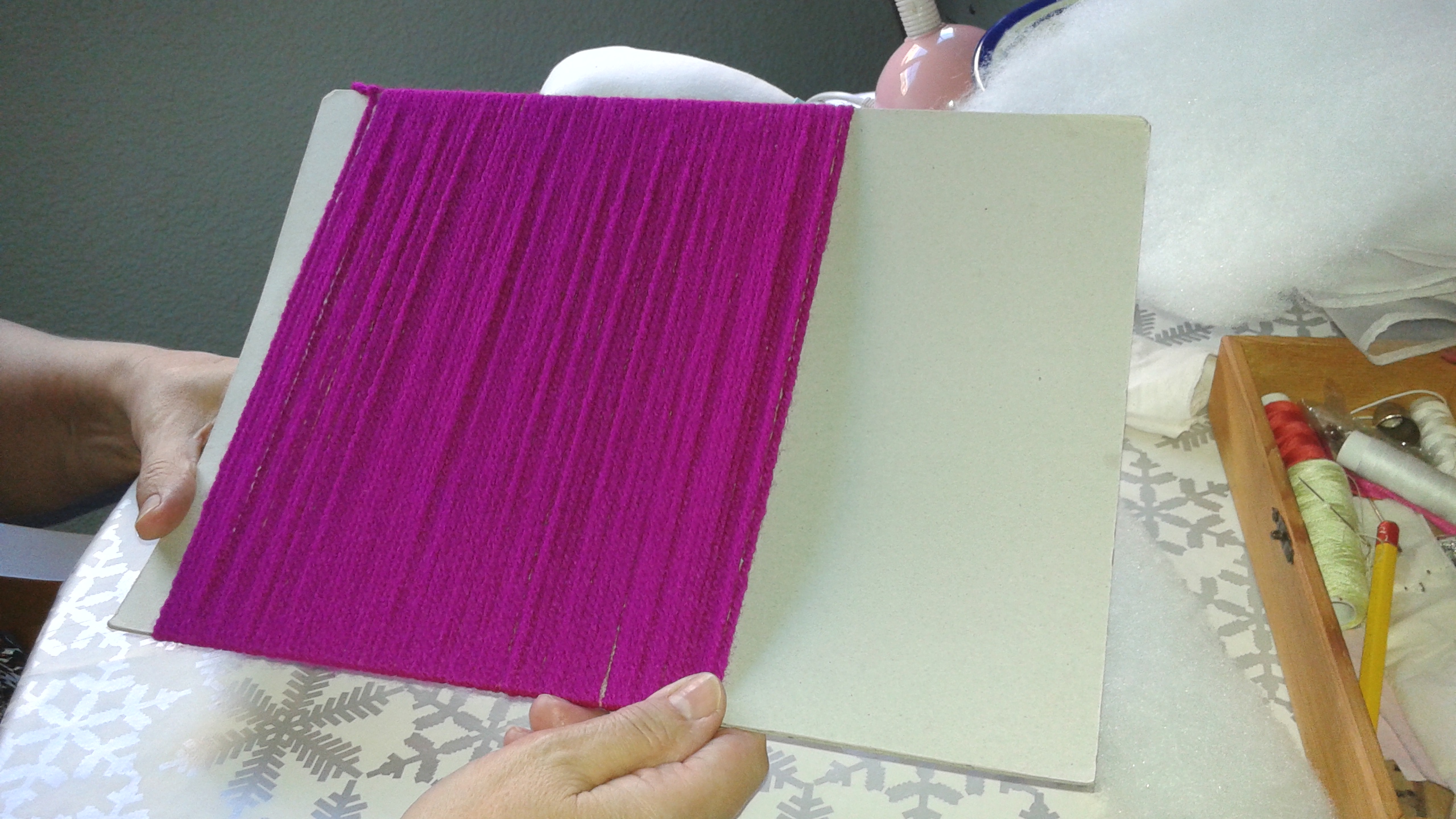 - Enrollamos lana del color que queramos en una cartulina rectangular, teniendo en cuenta que el ancho de esta será el largo del pelo.
