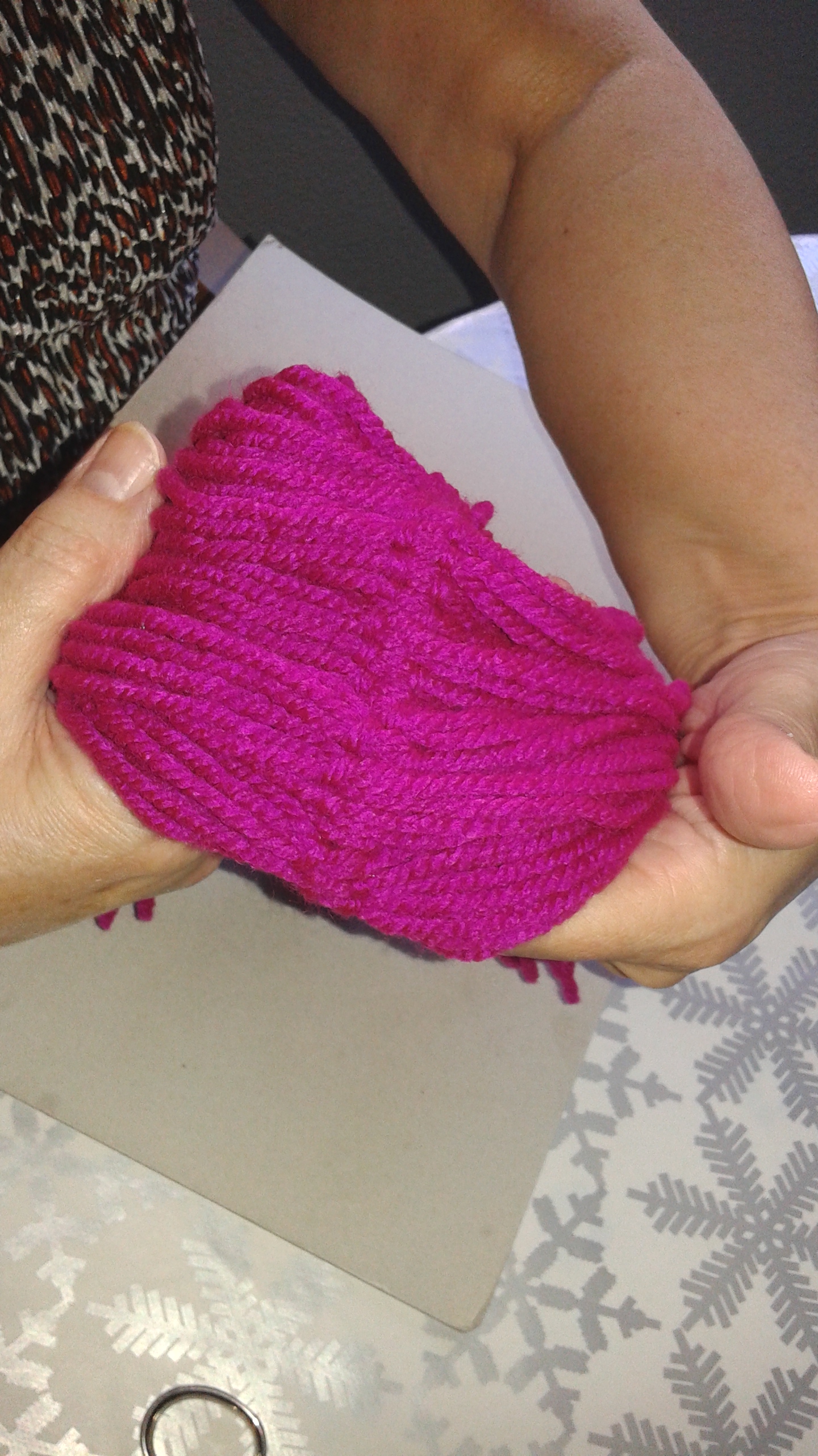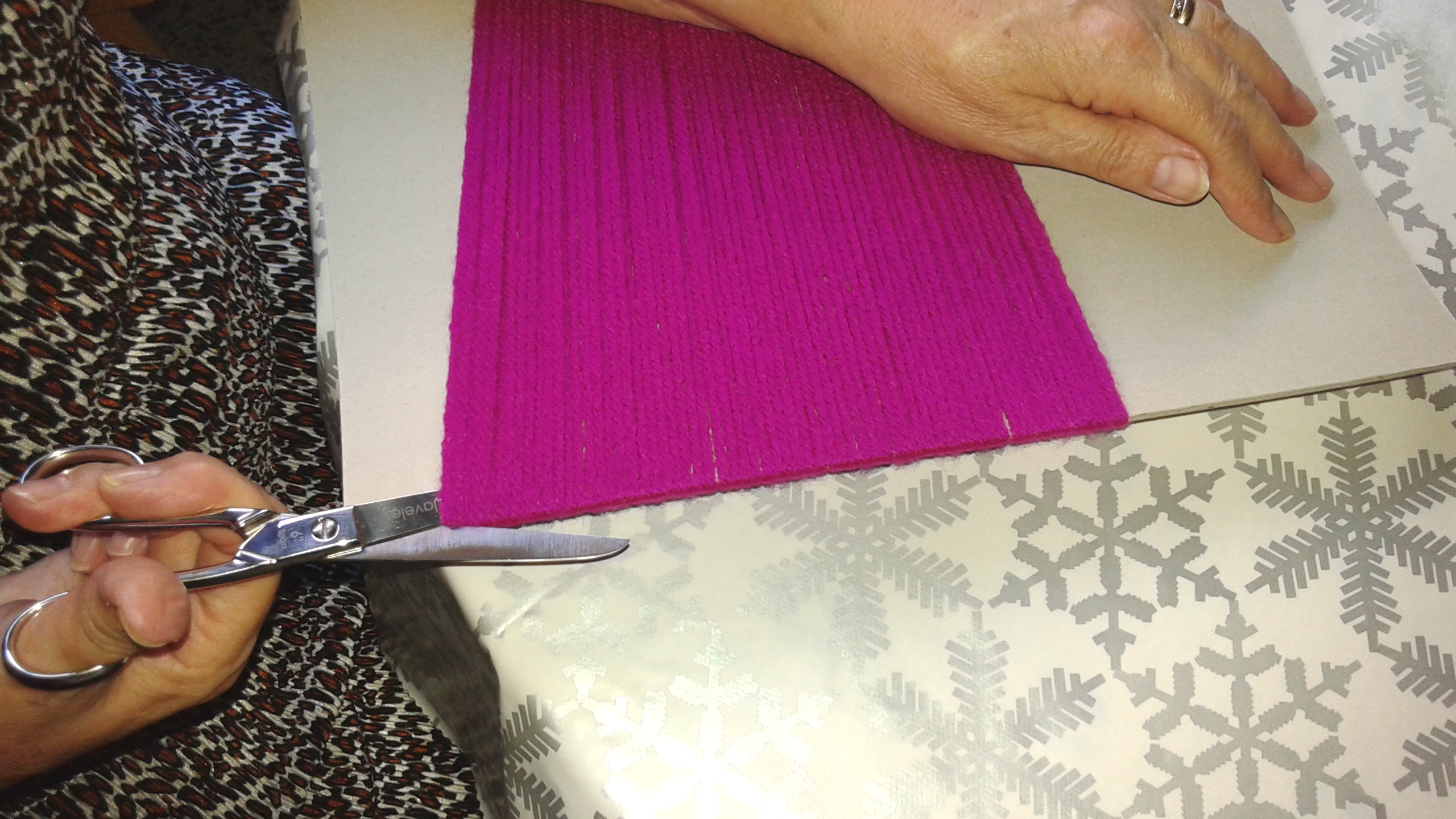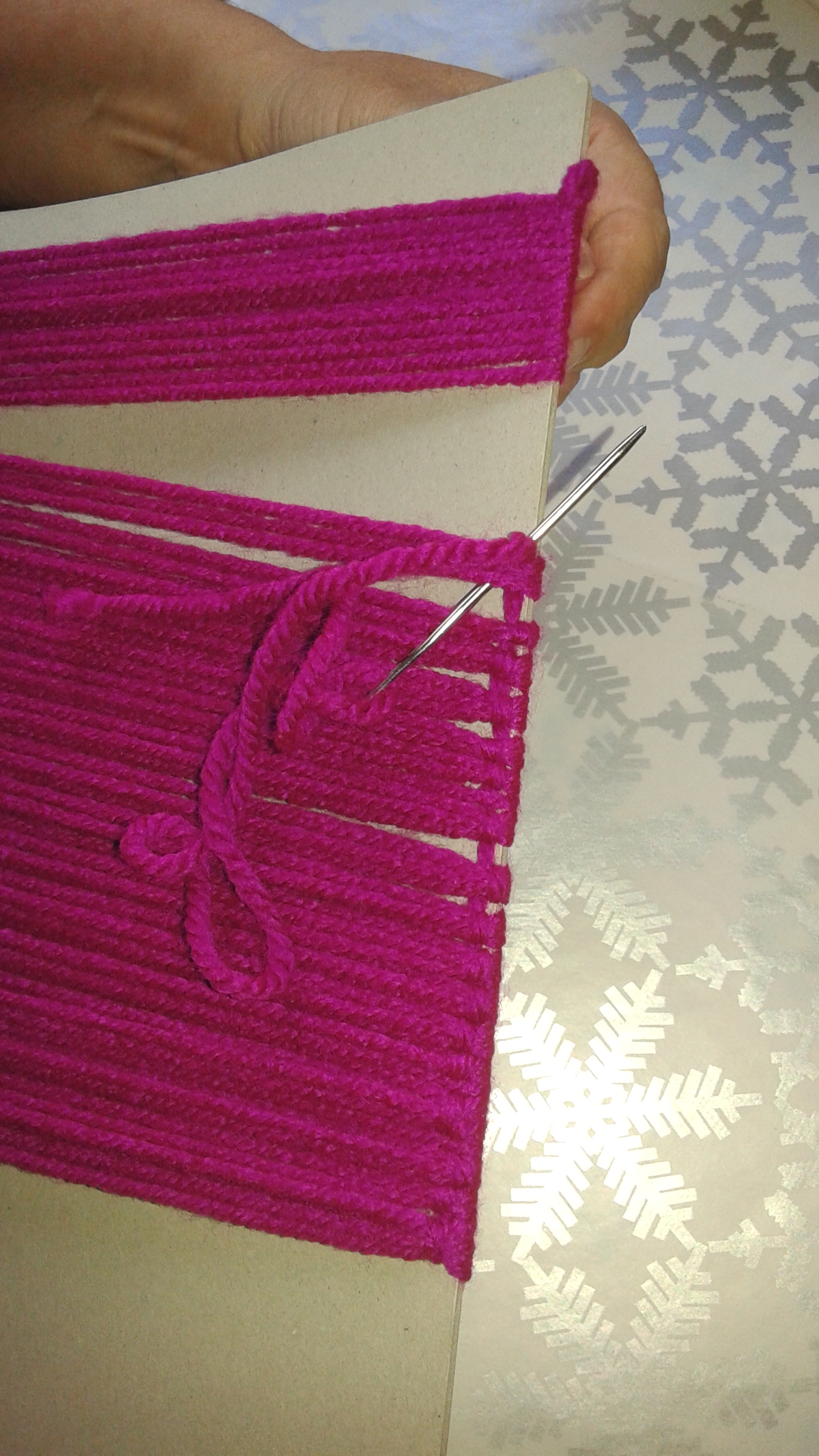 - Enrollamos lana del color que queramos en una cartulina rectangular, teniendo en cuenta que el ancho de esta será el largo del pelo.