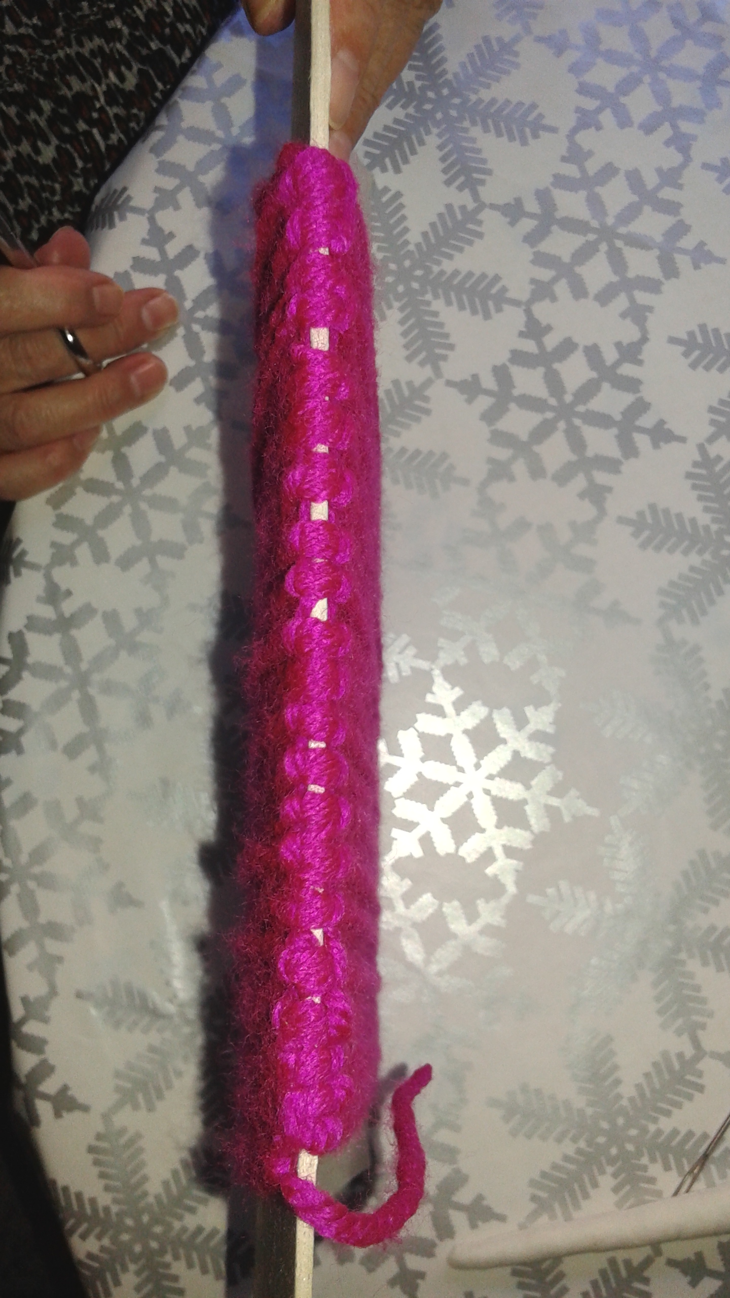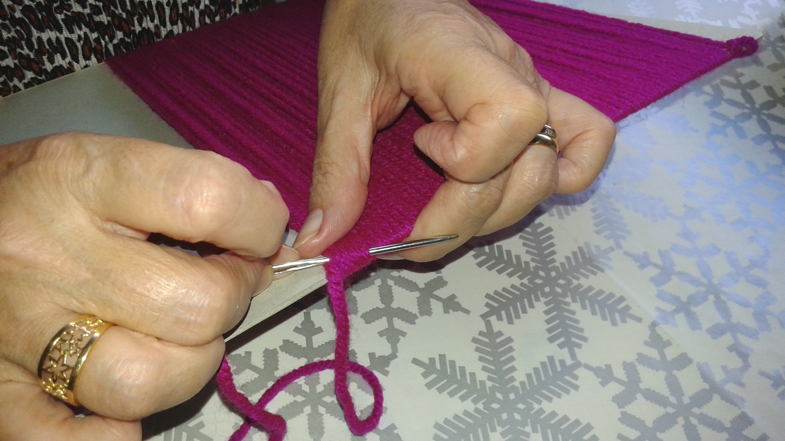 2. Unimos la lana ayudándonos con una aguja de punto. En este caso la hemos cosido cada tres «pelos». En la muñeca, esta zona será la ralla del pelo.