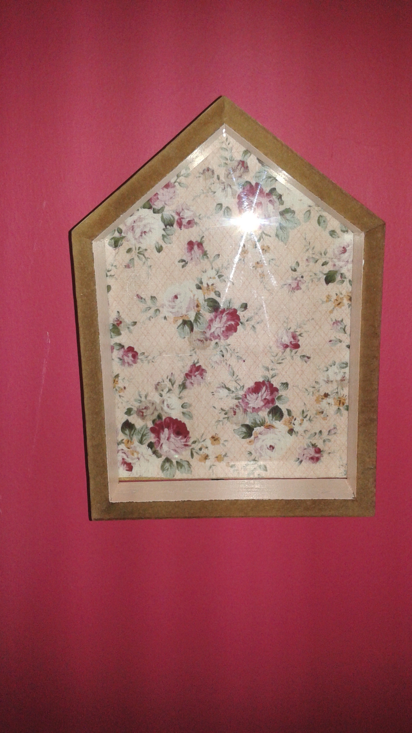 He combinado diferentes tendencias en decoración de pared que están en auge. Por una lado, el marco con forma de casa (7€ en Westwing) al cual le he puesto un retal de tela con un estampado muy romántico. Por otro lado, los marcos vintage (6€ cada uno en H&M). A dos de ellos les he quitado la parte trasera para que se viera la pared y al otro le he puesto un retal de tela en lugar de una foto.