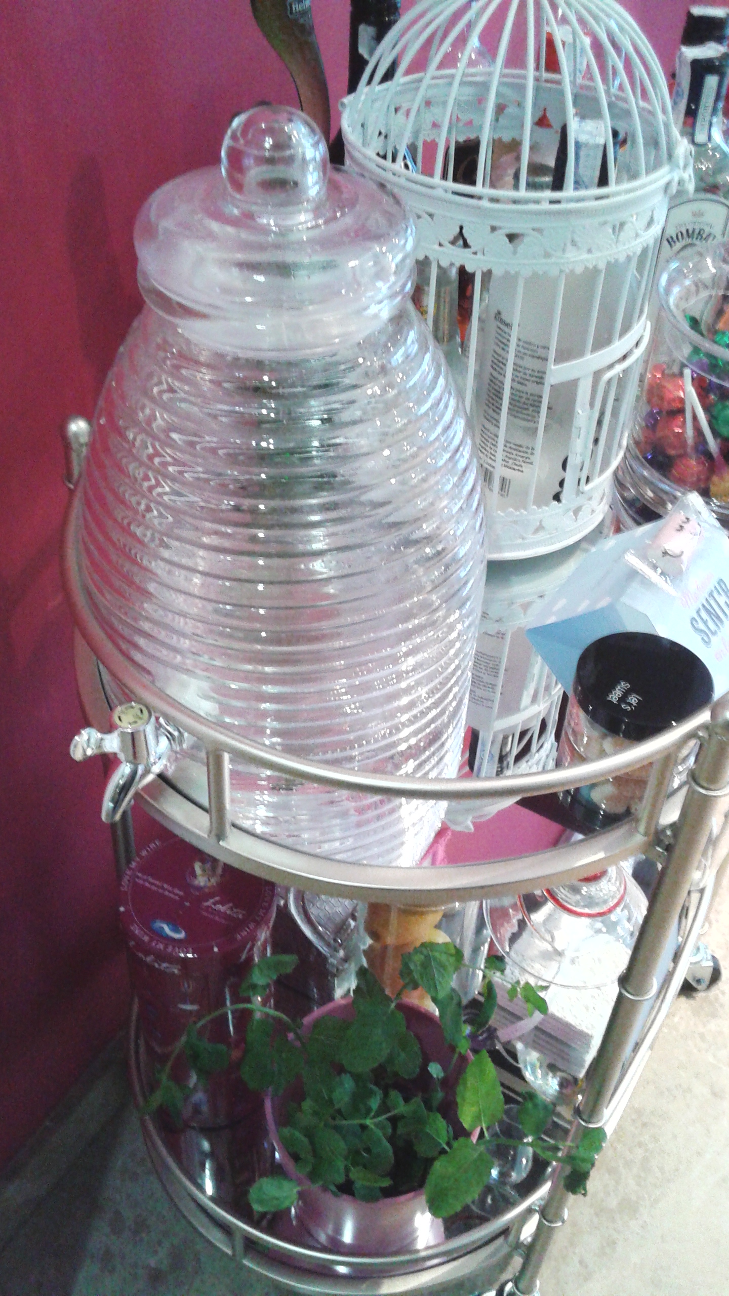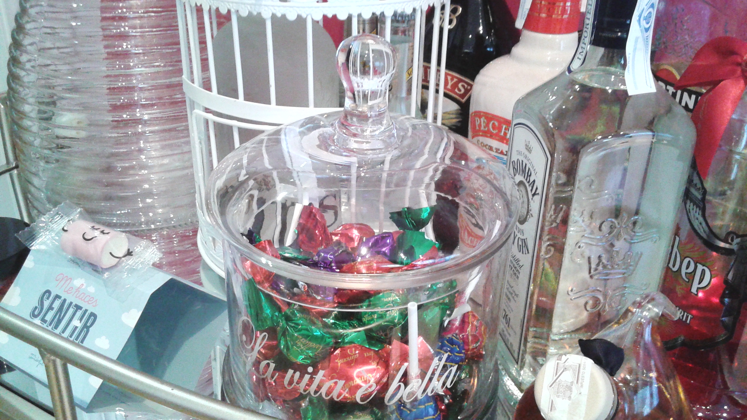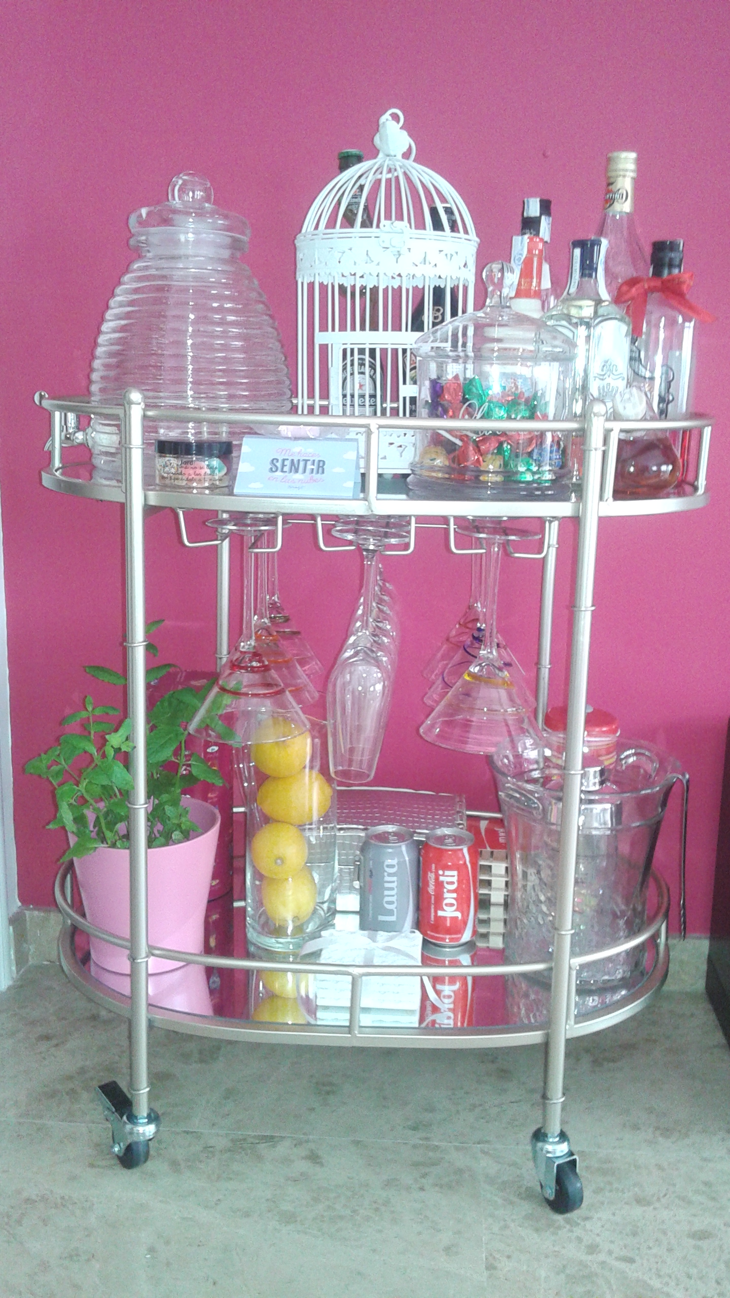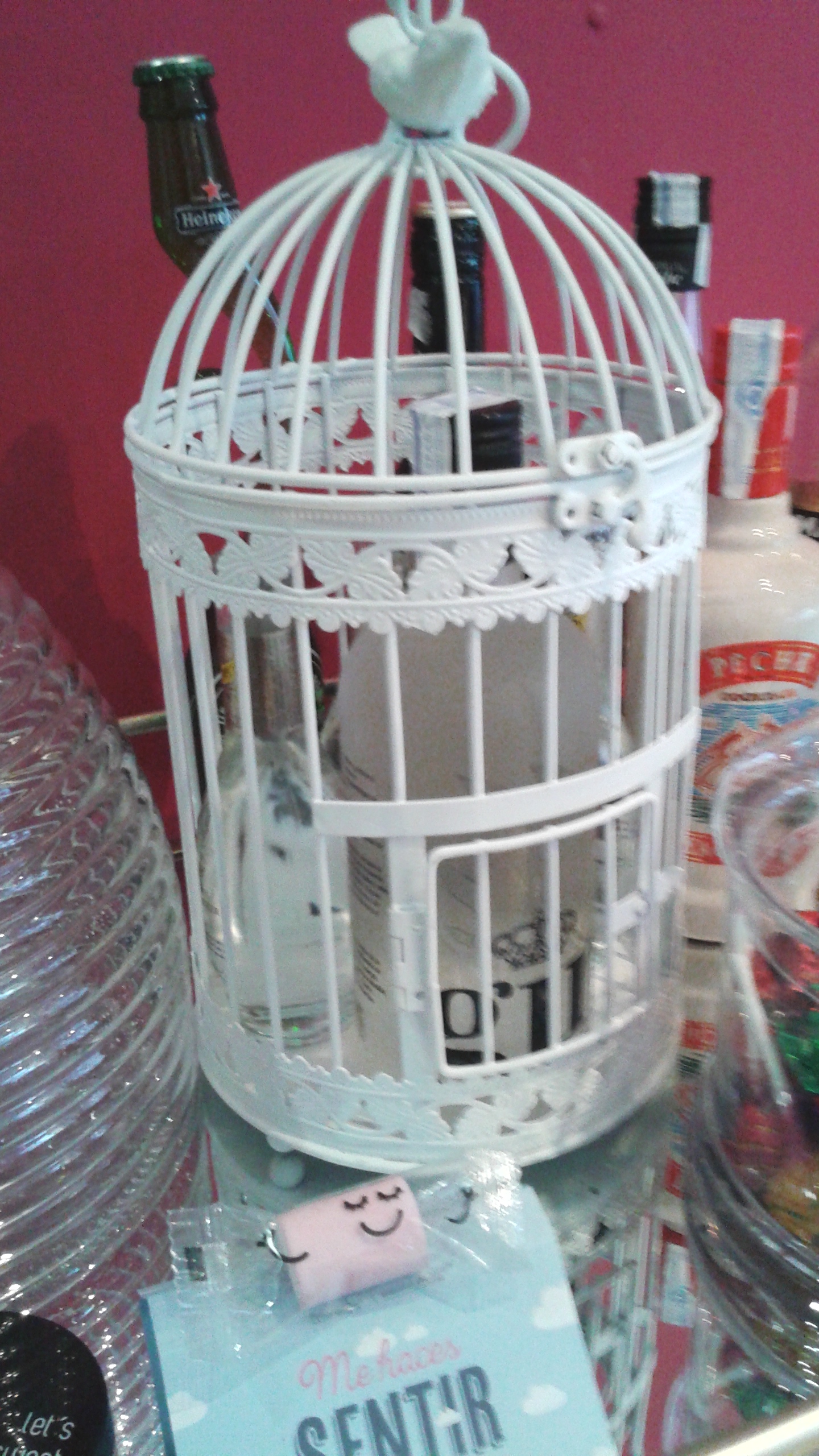 Las jaulas son otro de los complementos que se han puesto de moda. En este caso (Zara Home), le he dado un uso diferente al que estamos acostumbrados. He «encerrado» en ella una ginebra de una marca que es bastante cara y las tónicas para acompañarla (así la gente se lo pensará dos veces antes de hacerse un cubata con ella ;P).