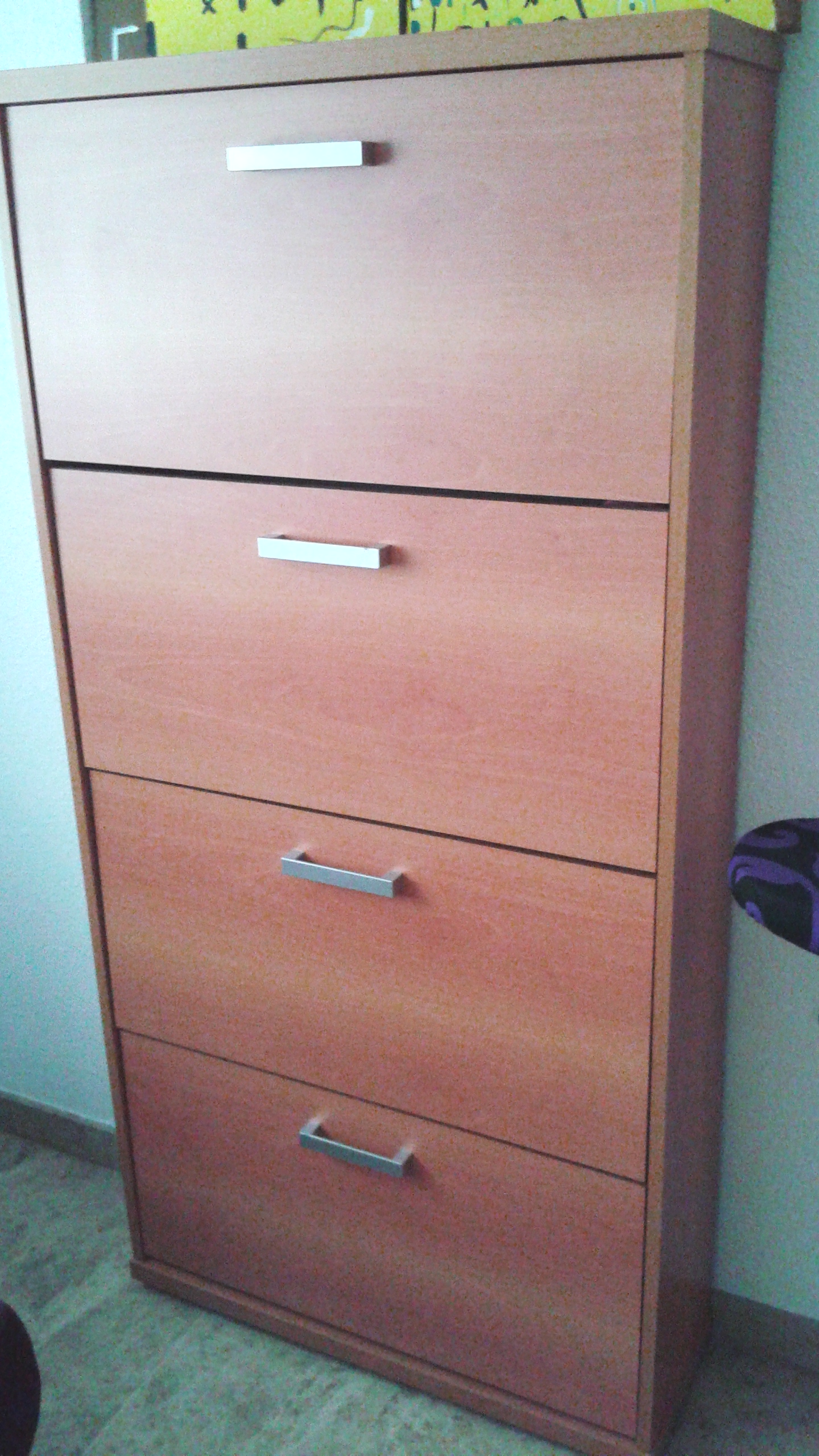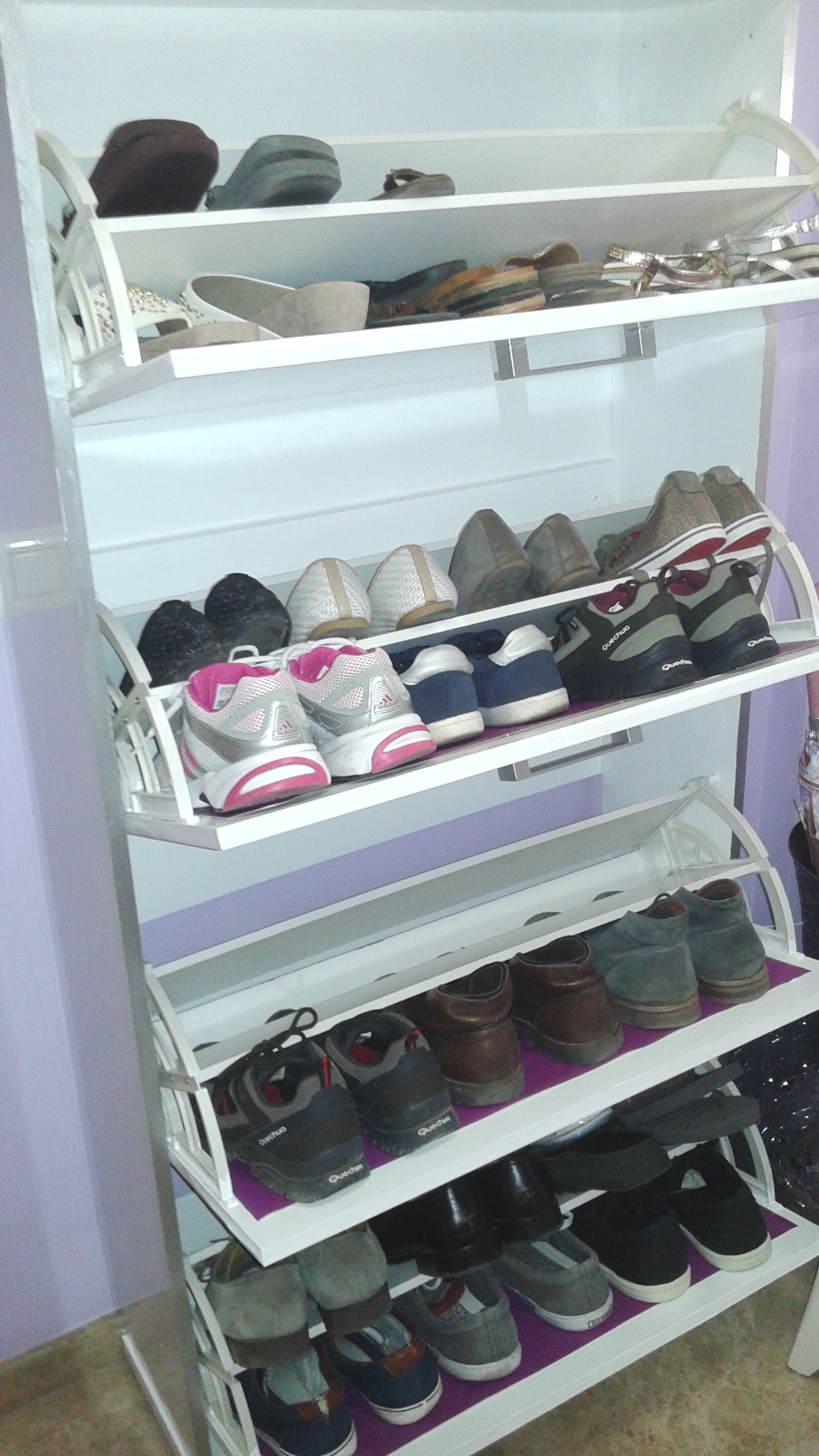 Tengo un zapatero que ocupa muy poco espacio y en el que caben un montón de zapatos. Me lo compre hace unos 15 años y en su día me costo 100€. Era el color exacto a los muebles de mi habitación (la de casa de mis padres) y ha sobrevivido todos estos años y a una mudanza, por lo que vale el dinero que me costó.