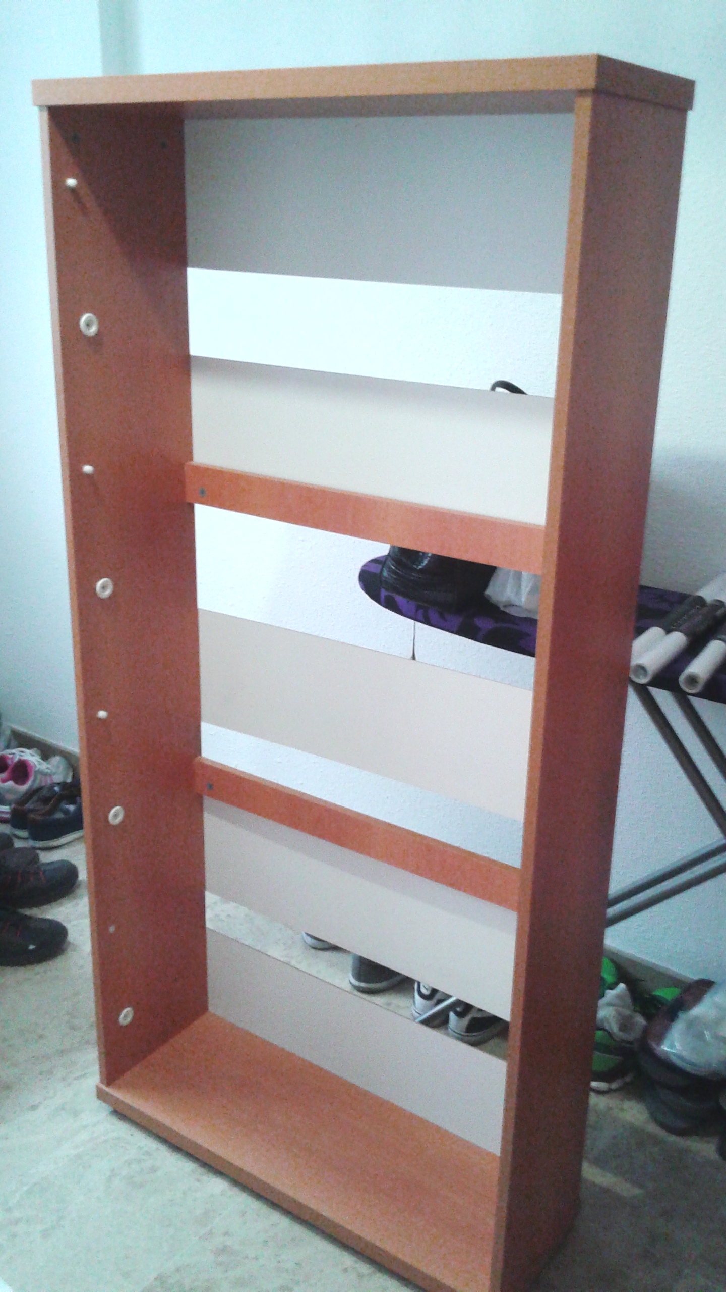 Para llegar bien a todos los sitios, he desmontado el mueble: por una lado la estructura y por otro las bandejas de los zapatos. Así también he podido vinilar mas cómodamente las puertas, ya que lo he hecho sobre una mesa.