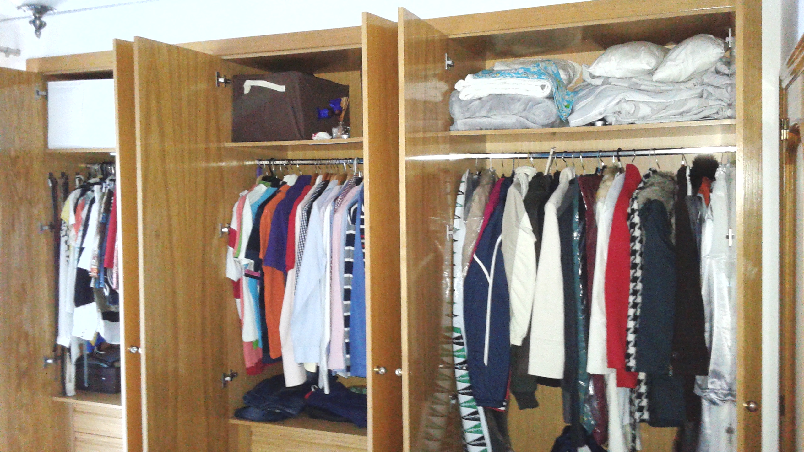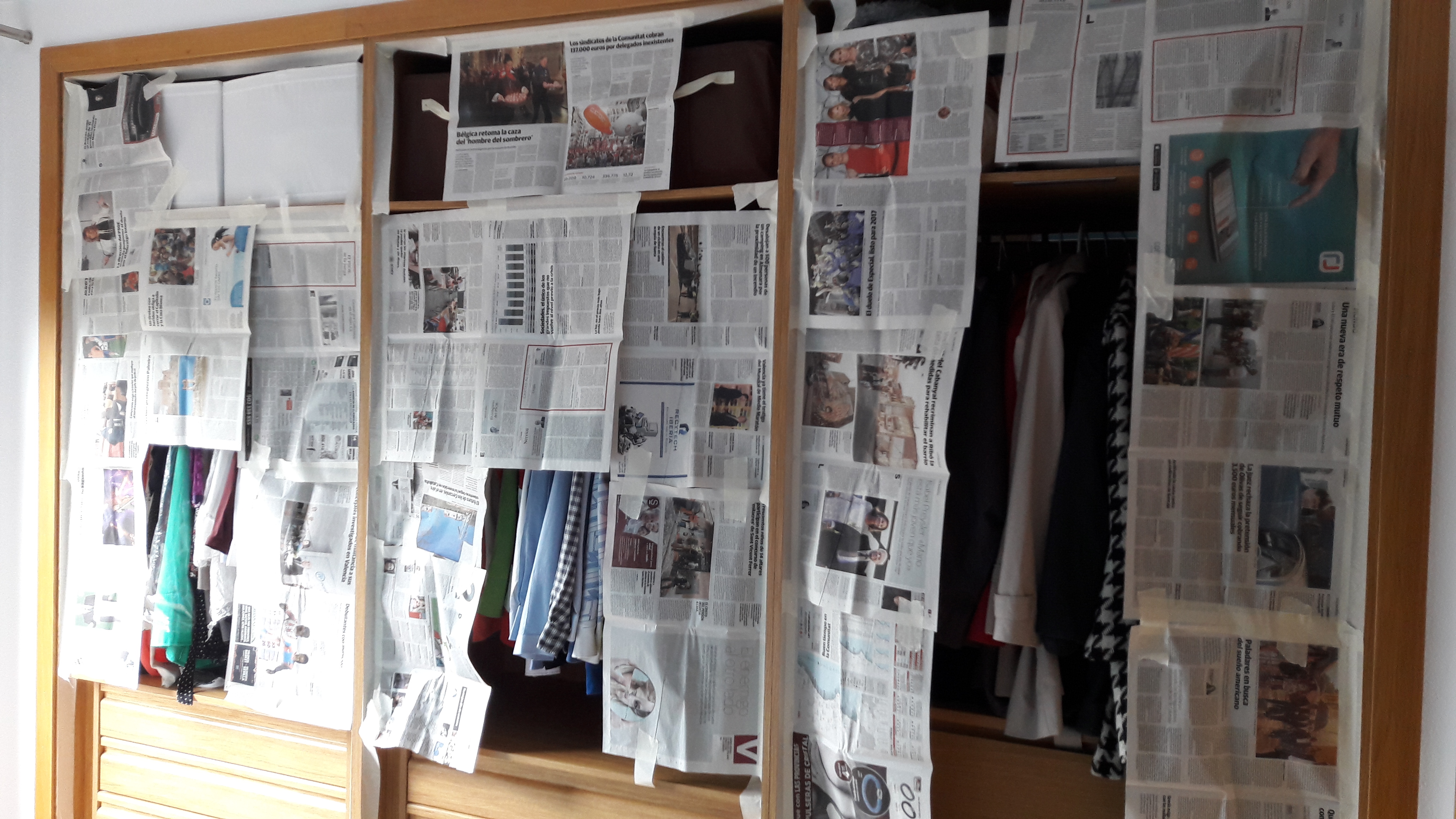 8. Como en el interior hay ropa (hubiera sido una locura sacarla toda) la he protegido con cinta de carrocero y periódicos, que además me permiten acceder a las perchas y cajones.