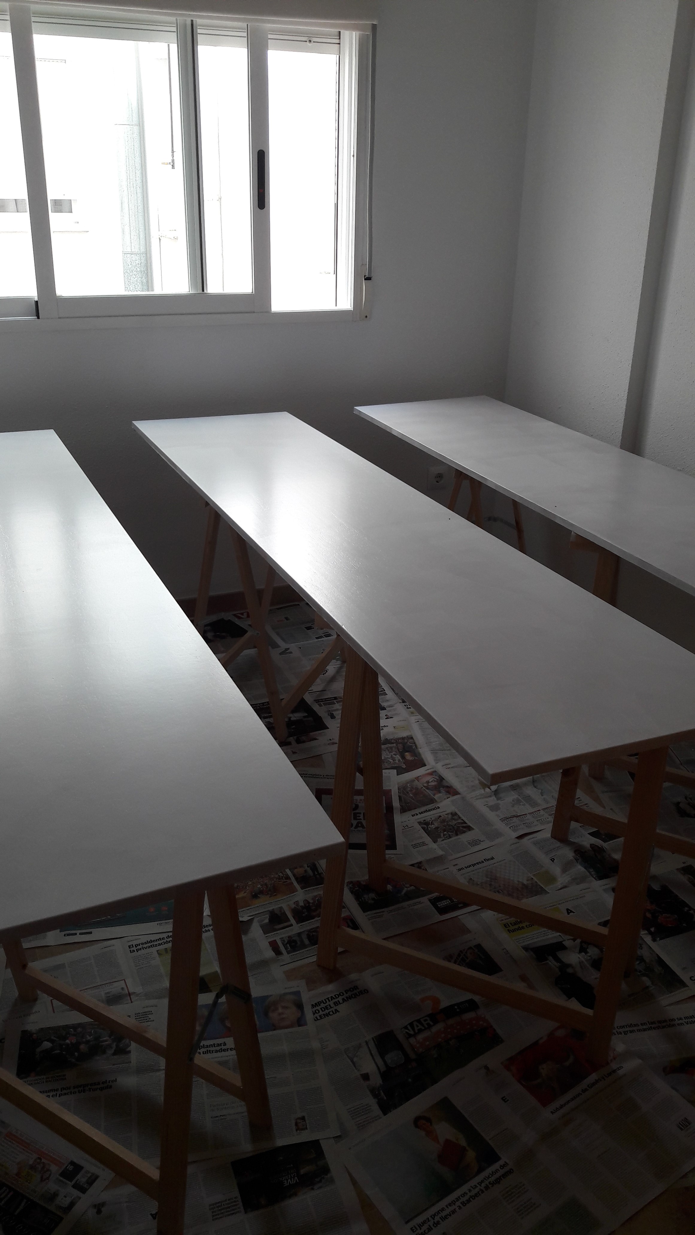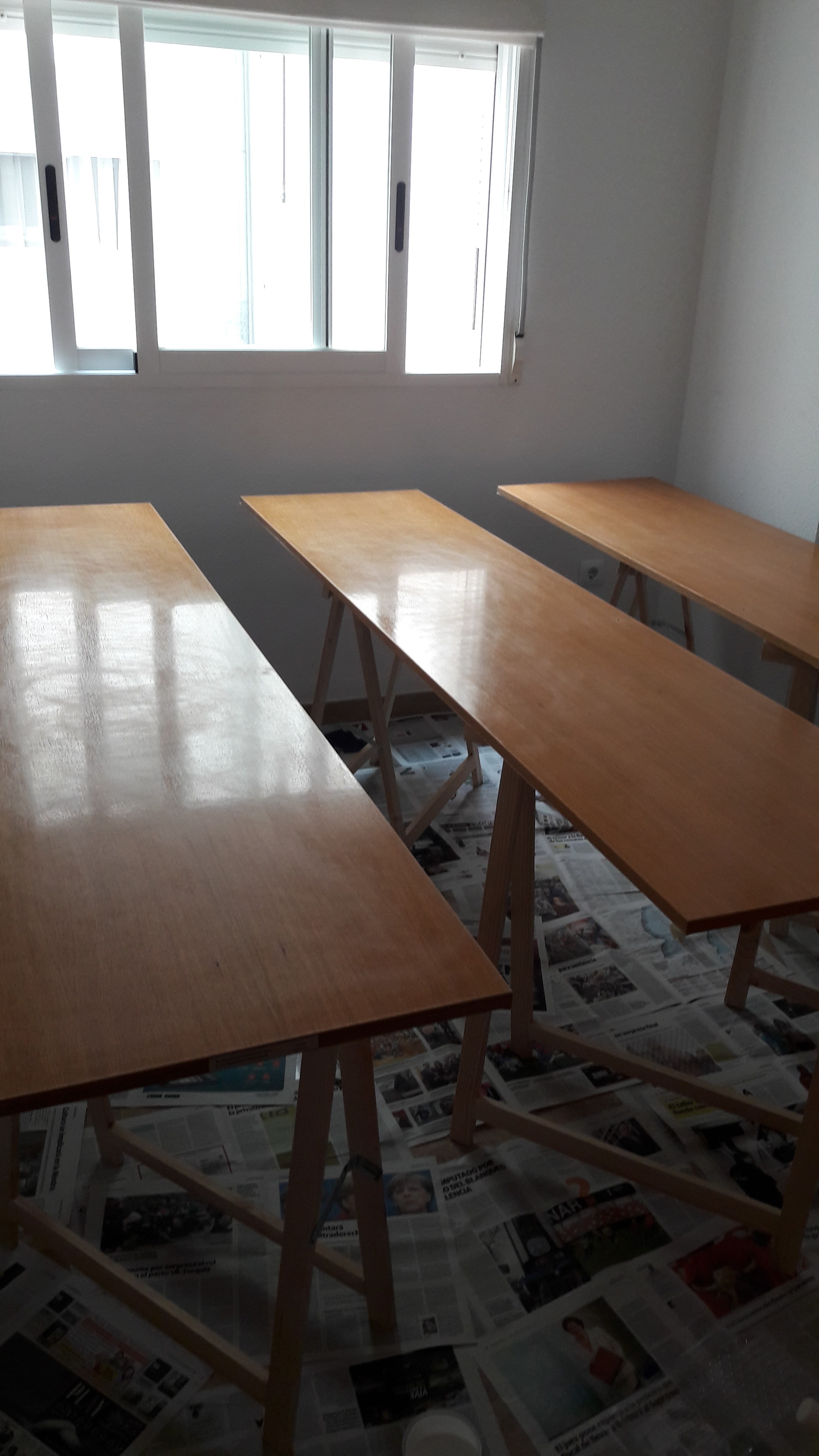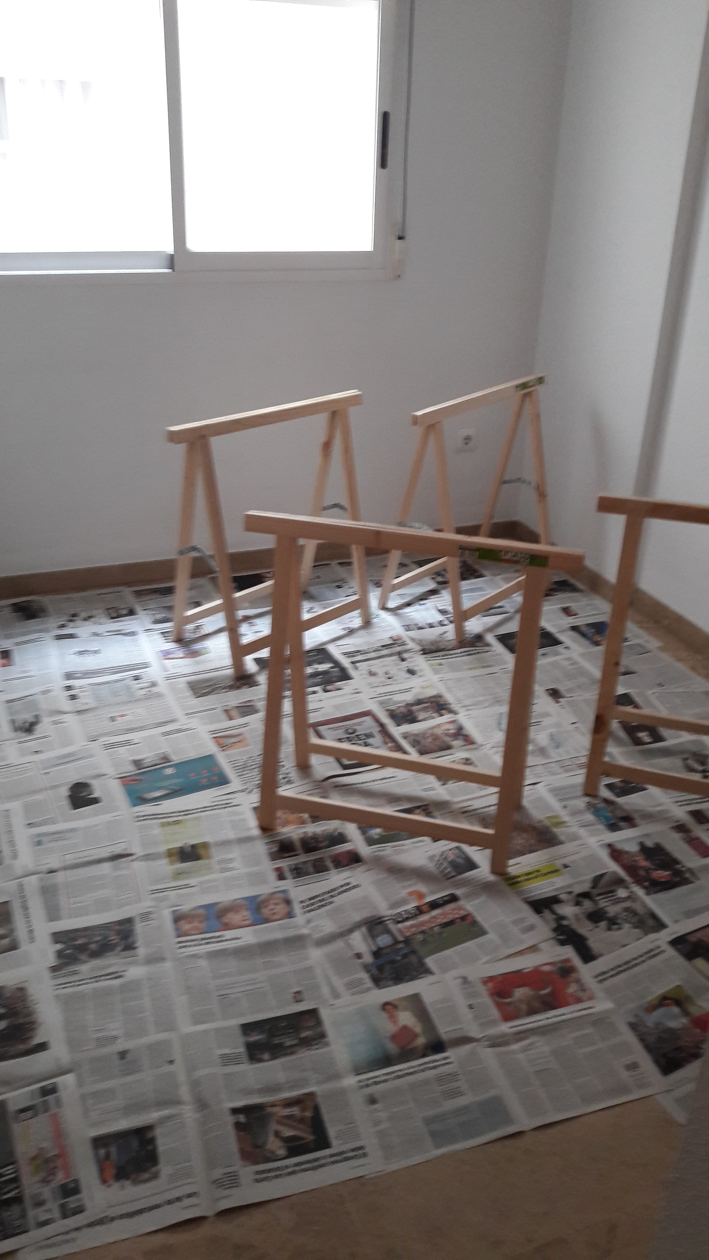 Una de las habitaciones de mi casa, está libre y la he utilizado de taller. He colocado 6 caballetes (Leroy Merlin por 3,38€/u) y, tras desmontar las puertas de los armarios y quitar bisagras y tiradores, las he colocado sobre ellos. Es mejor que colocarlas en el suelo sobre periódicos, ya que estos terminan pegándose y la posición es muy incómoda.