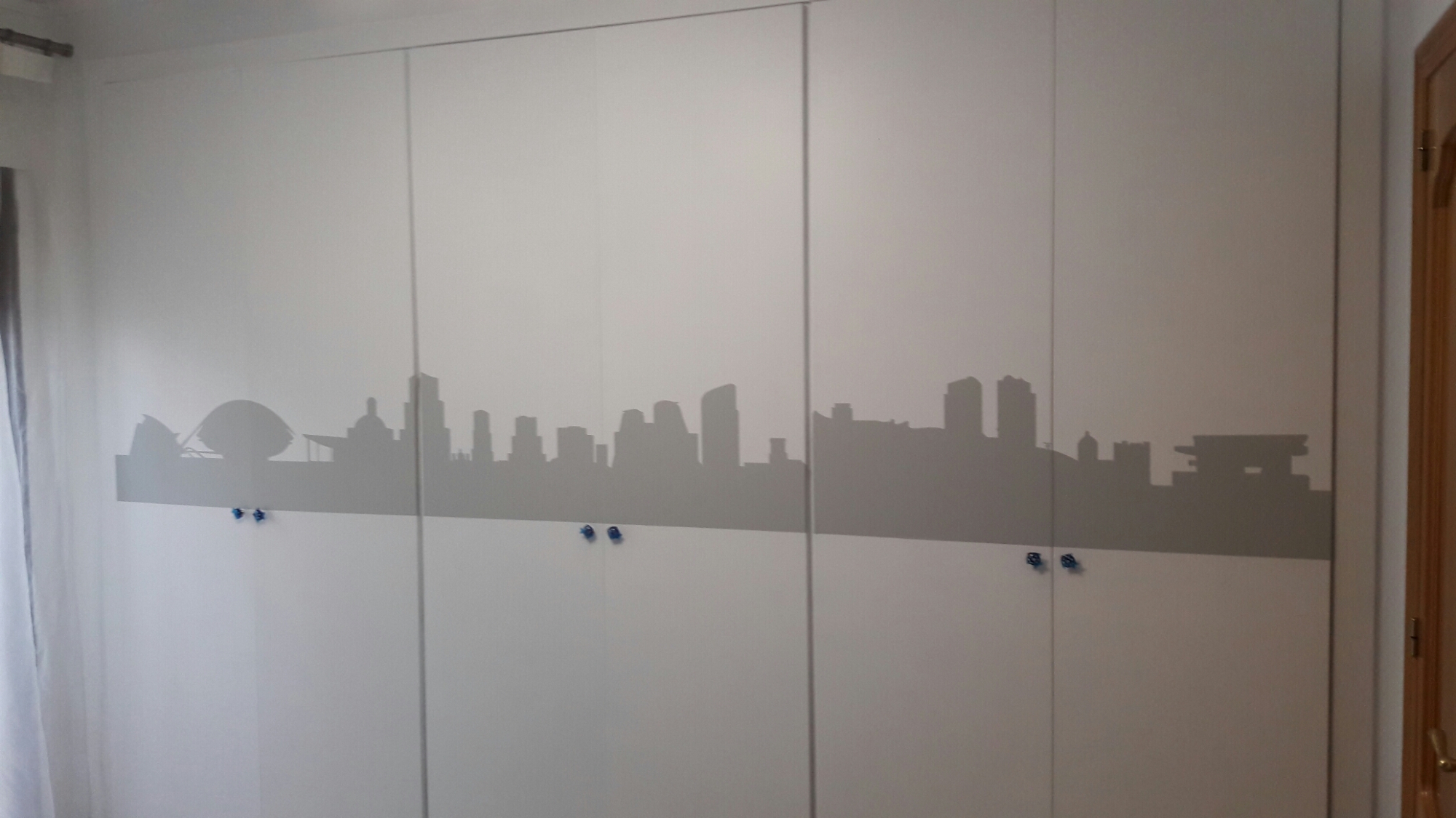 También he añadido un vinilo del skyline de Valencia, que me encanta y le da un toque original y diferente a las puertas. Se coloca con las puertas cerradas y con un cútex se corta aprovechando las ranuras de las puertas para poder abrirlas sin problemas (para ver como se coloca un vinilo, visita el post: Vinilar un mueble de melamina).