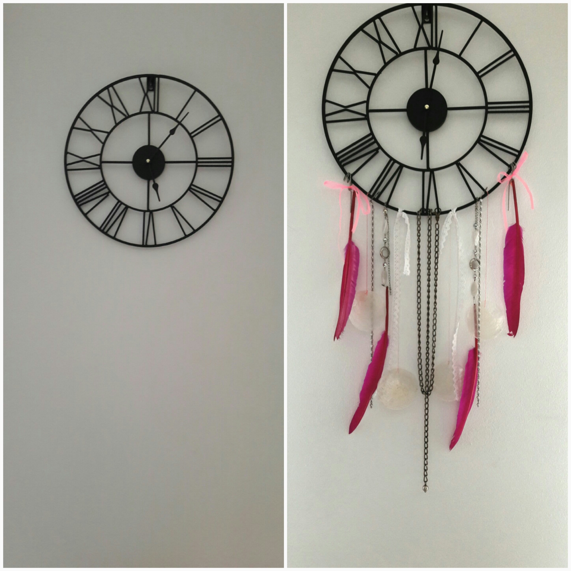 En mi caso he aprovechado un reloj de forja muy sencillo que me compré en Casa por 10€, como aro. Y le he colgado prácticamente de todo lo que he pillado por casa ;P