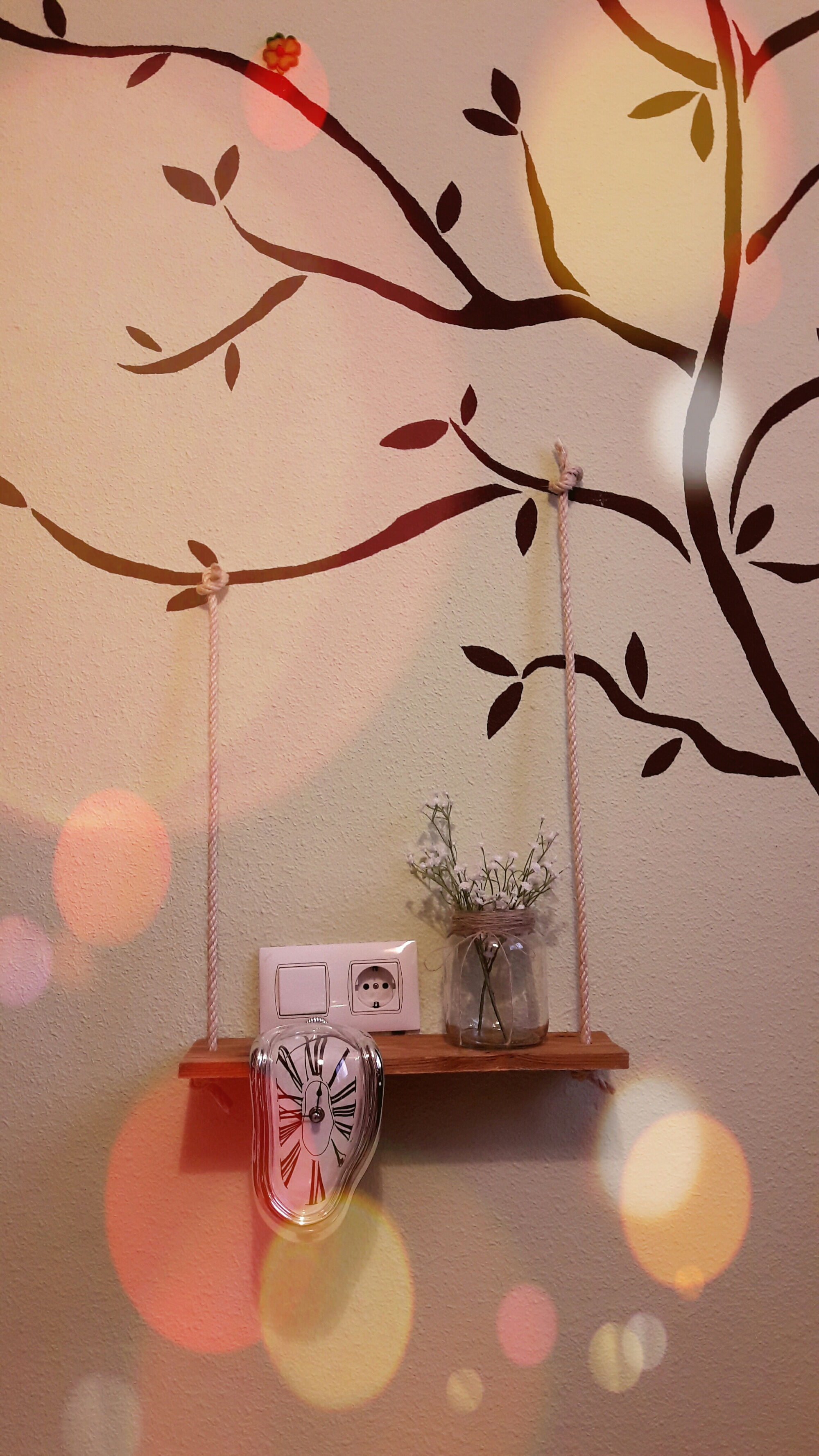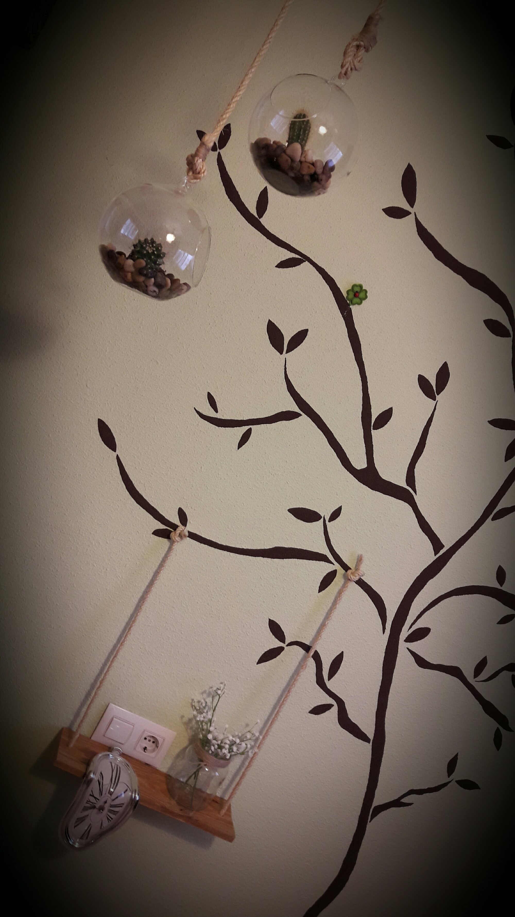 pero en mi caso la he colocado en el árbol que pinté hace tiempo en el estudio, a modo de columpio. Y me sirve de mesita para un enchufe que no utilizaba por no tener donde apoyar las cosas.