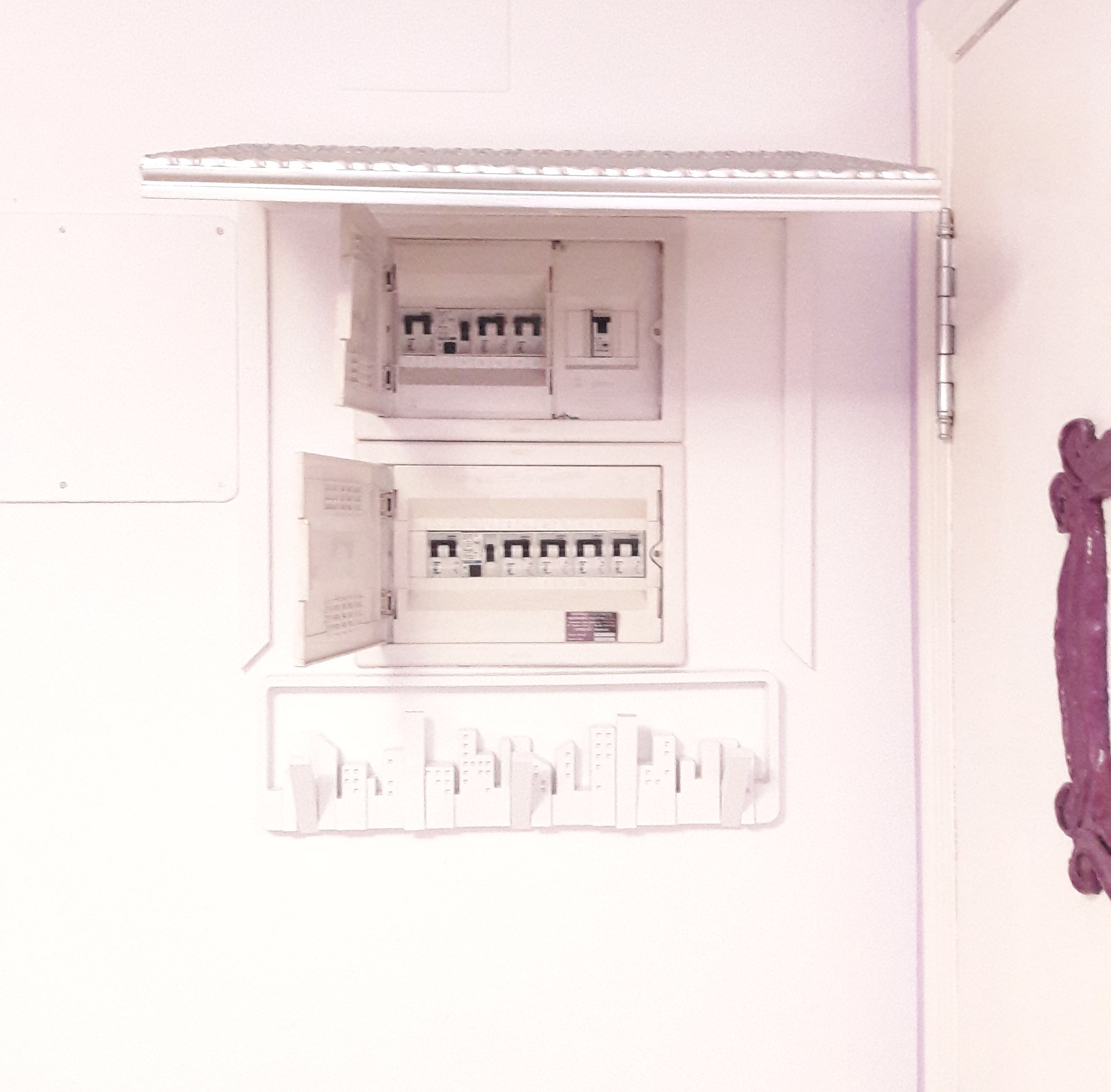 Tenía puesto un cuadro encima para taparlo, pero cada vez que saltaba el automático era un engorro tener que quitarlo y volverlo a poner. Así que le he añadido un premarco y unas bisagras para que se pueda abatir. Os cuento como lo he hecho.