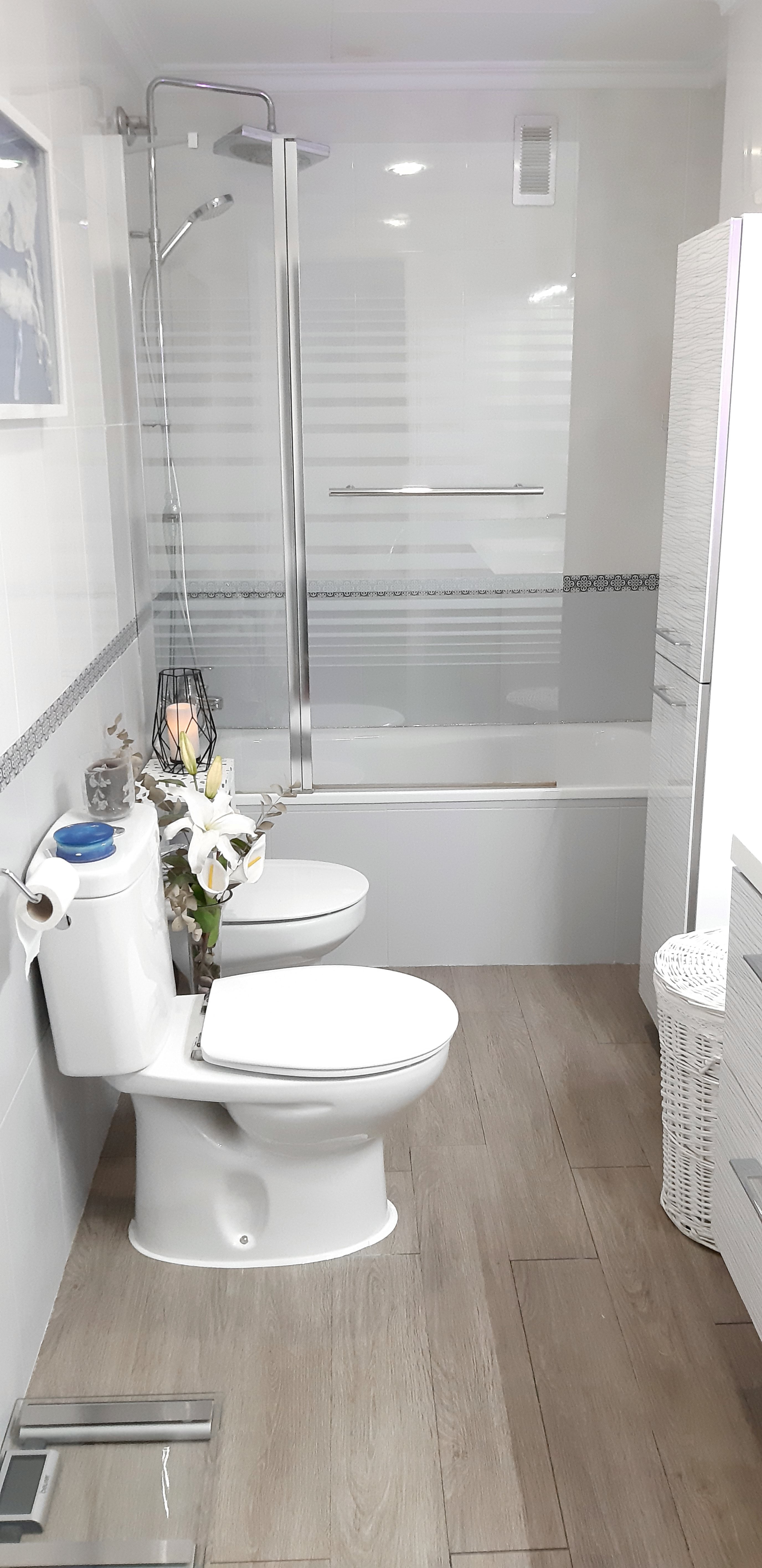 Y la transformación más sorprendente se la ha llevado el suelo. Yo misma puse unas lamas vinílicas con aspecto de madera. Es un tipo de material muy práctico para colocar en cuartos húmedos ya que es antideslizante, resistente e impermeable. Y además es más cálido al tacto que la baldosa cerámica. Y la textura de la madera está muy conseguida. Los tenemos ya varios años y estoy encantada.