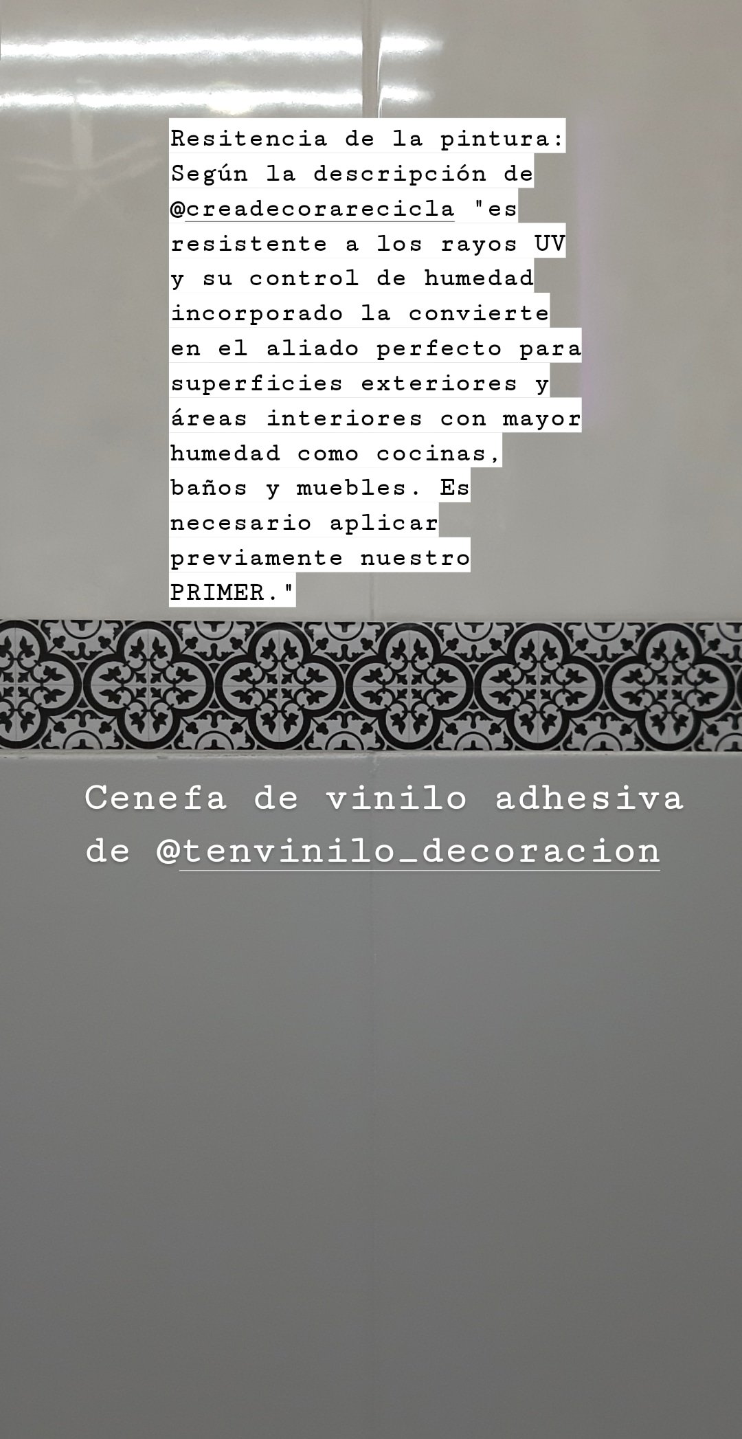 Al principio solo pinté la cenefa, pero, con el tiempo, en la zona de la ducha, se iba soltando y tenía que repasarla muy a menudo. Así que le he puesto una cenefa adhesiva de vinilo con estampado de azulejo marroquí, que espero que me dure muchos años. Y si no o si me canso, no pasa nada, porque se puede quitar muy fácilmente, lo cual también es ideal para pisos de alquiler.