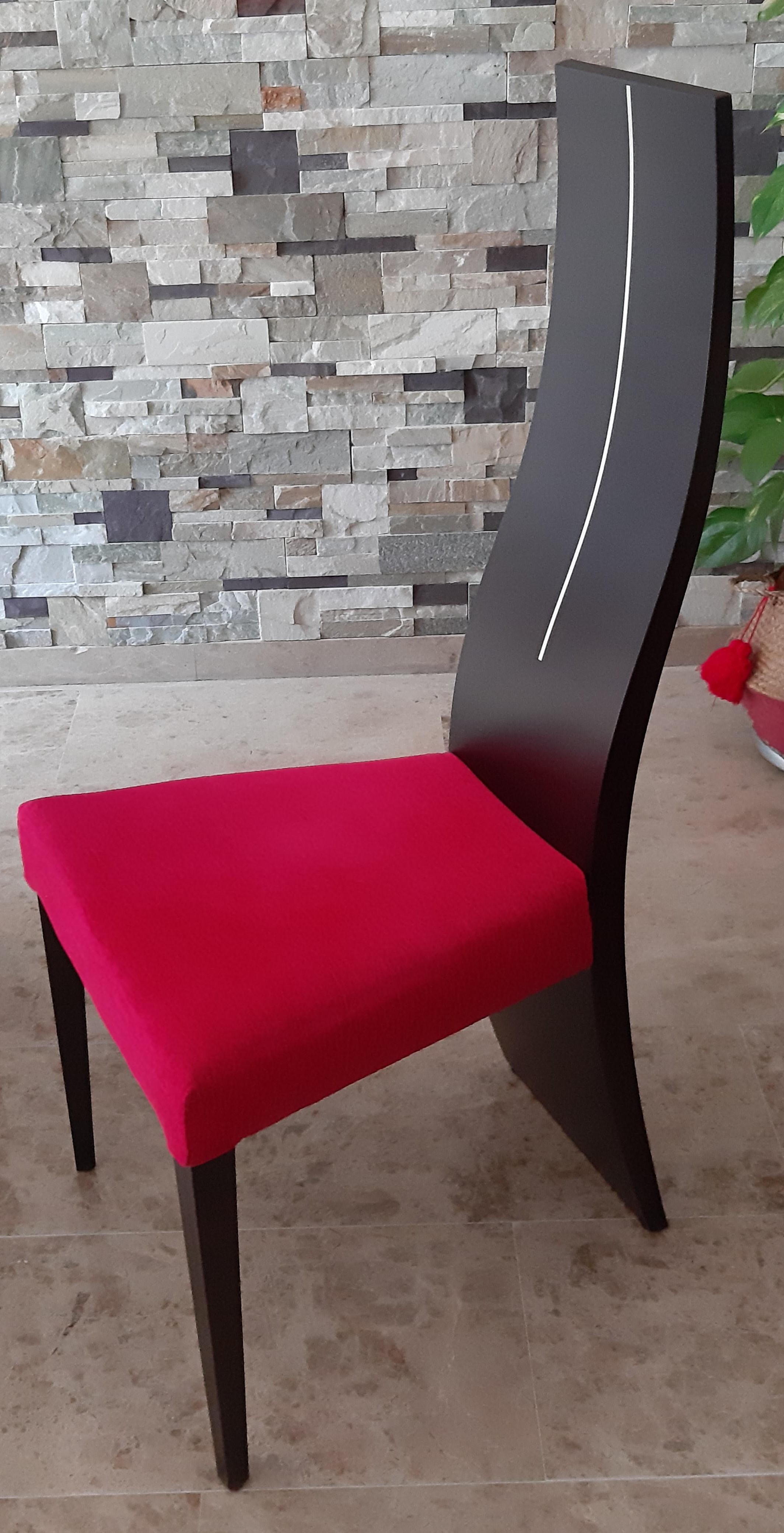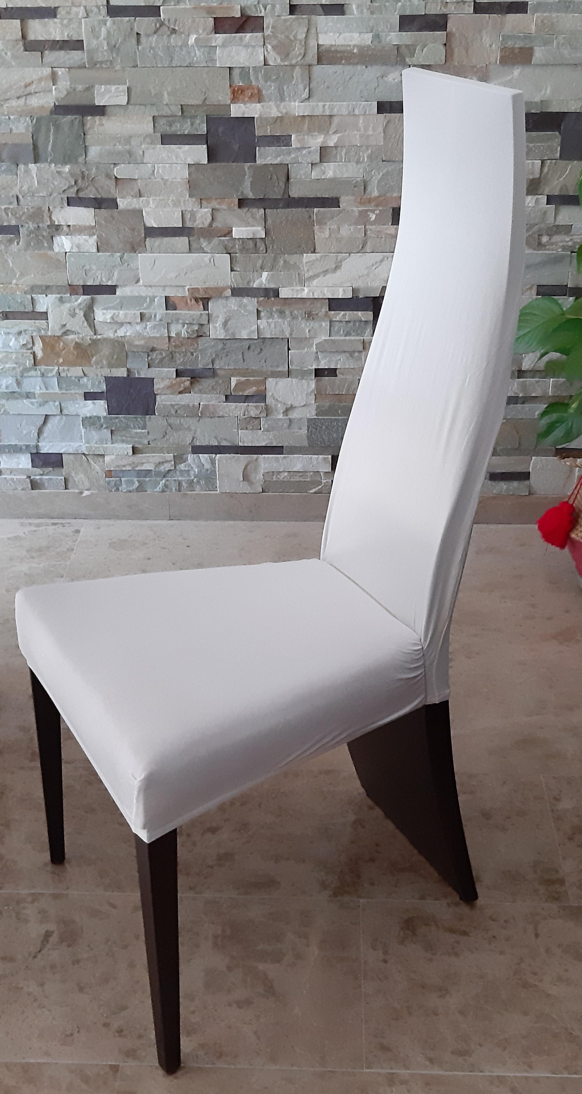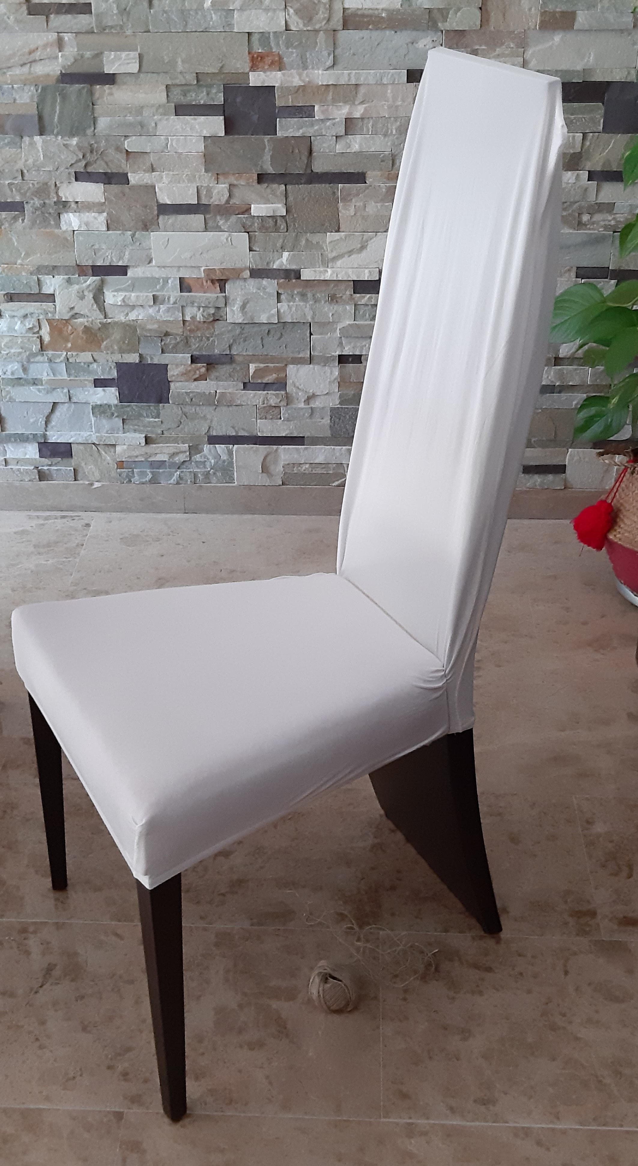 Con respecto a las sillas, en su día me costó mucho encontrarlas a buen precio porque son de madera y de diseño. Pero ahora no me convence su estilo y necesitaba un cambio. Lo más económico que se me ha ocurrido y además que sea reversible por si me arrepiento, es colocarle unas fundas. En un principio pensé hacerlas yo, porque tienen una forma bastante peculiar, pero al final encontré unas en Amazon elásticas y súper baratas (las 4 no ha llegado a 18€). Solo tuve que ajustarlas de una manera muy sencilla y el cambio ha sido tremendo. Y lo mejor que es que las he actualizado sin perjudicar a la silla, porque encima la estoy protegiendo de manchas o rozaduras.