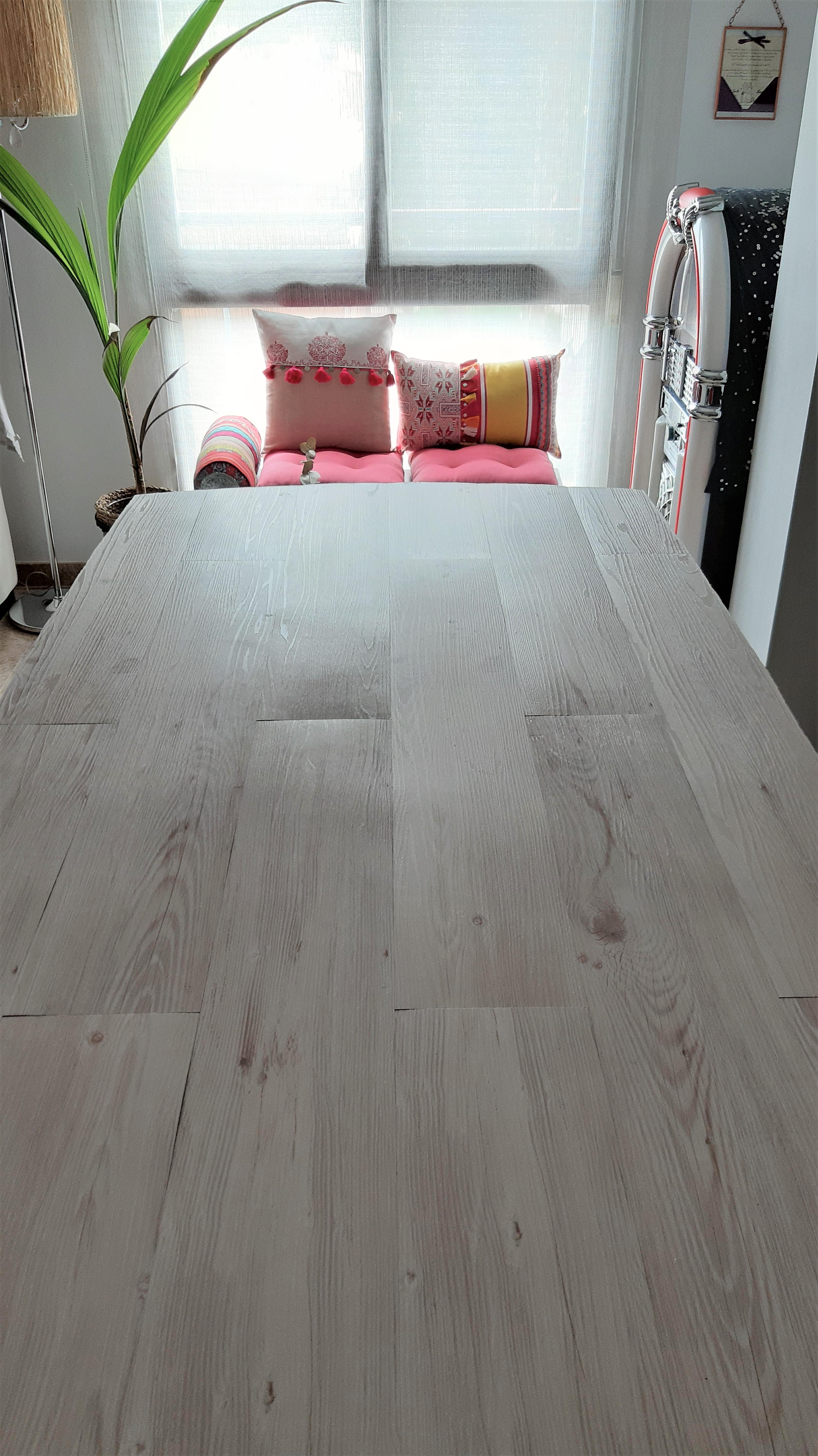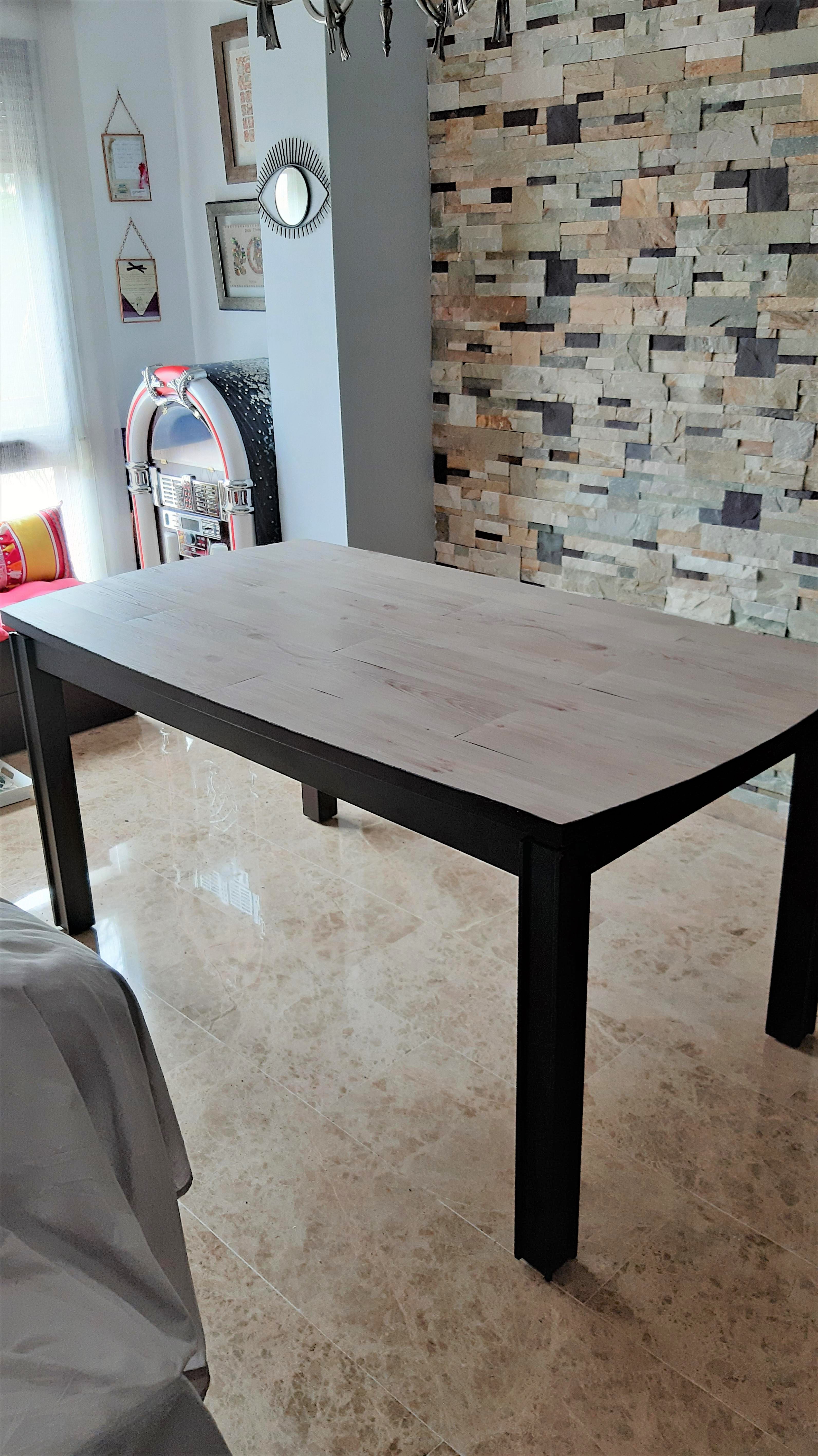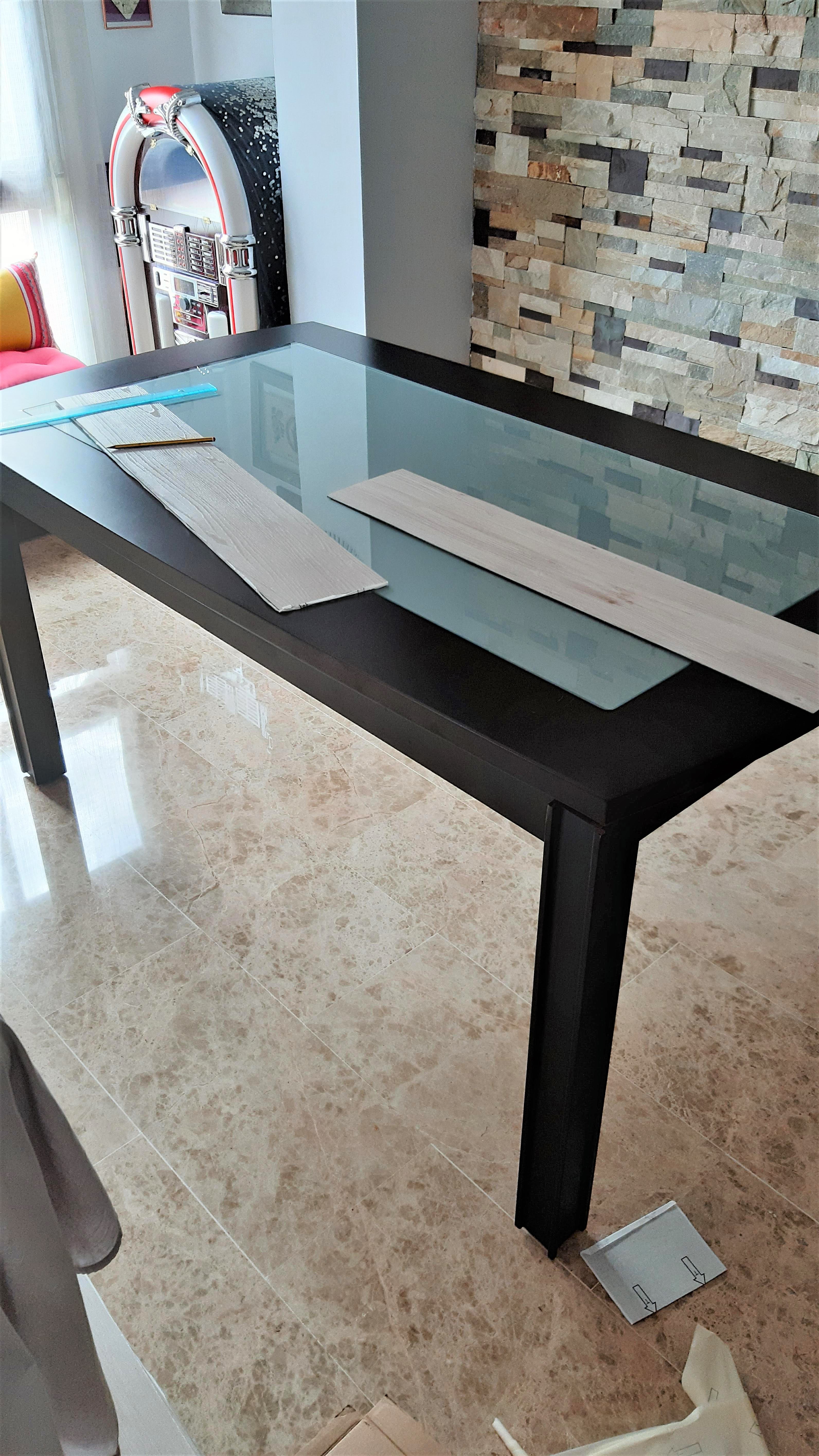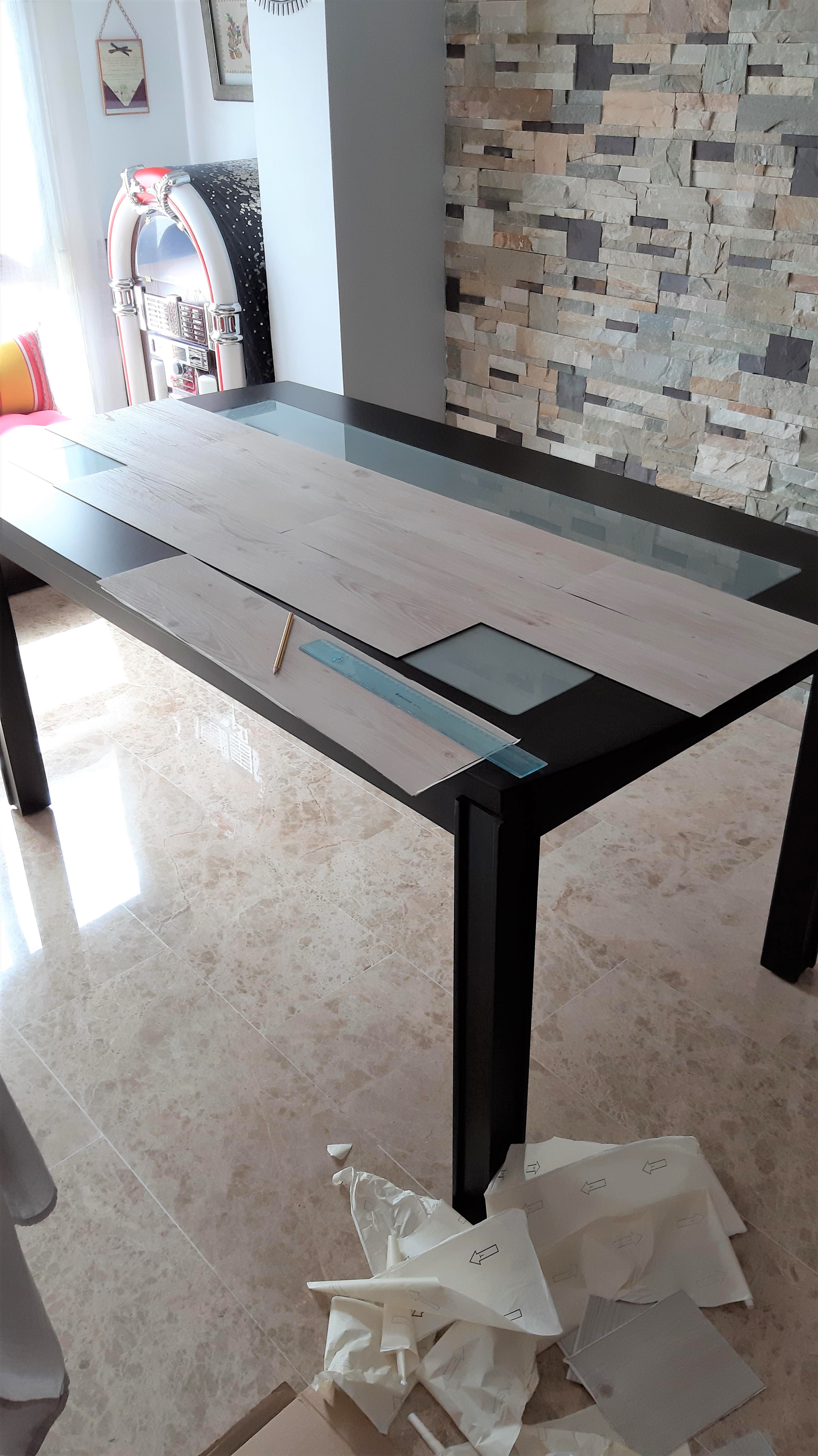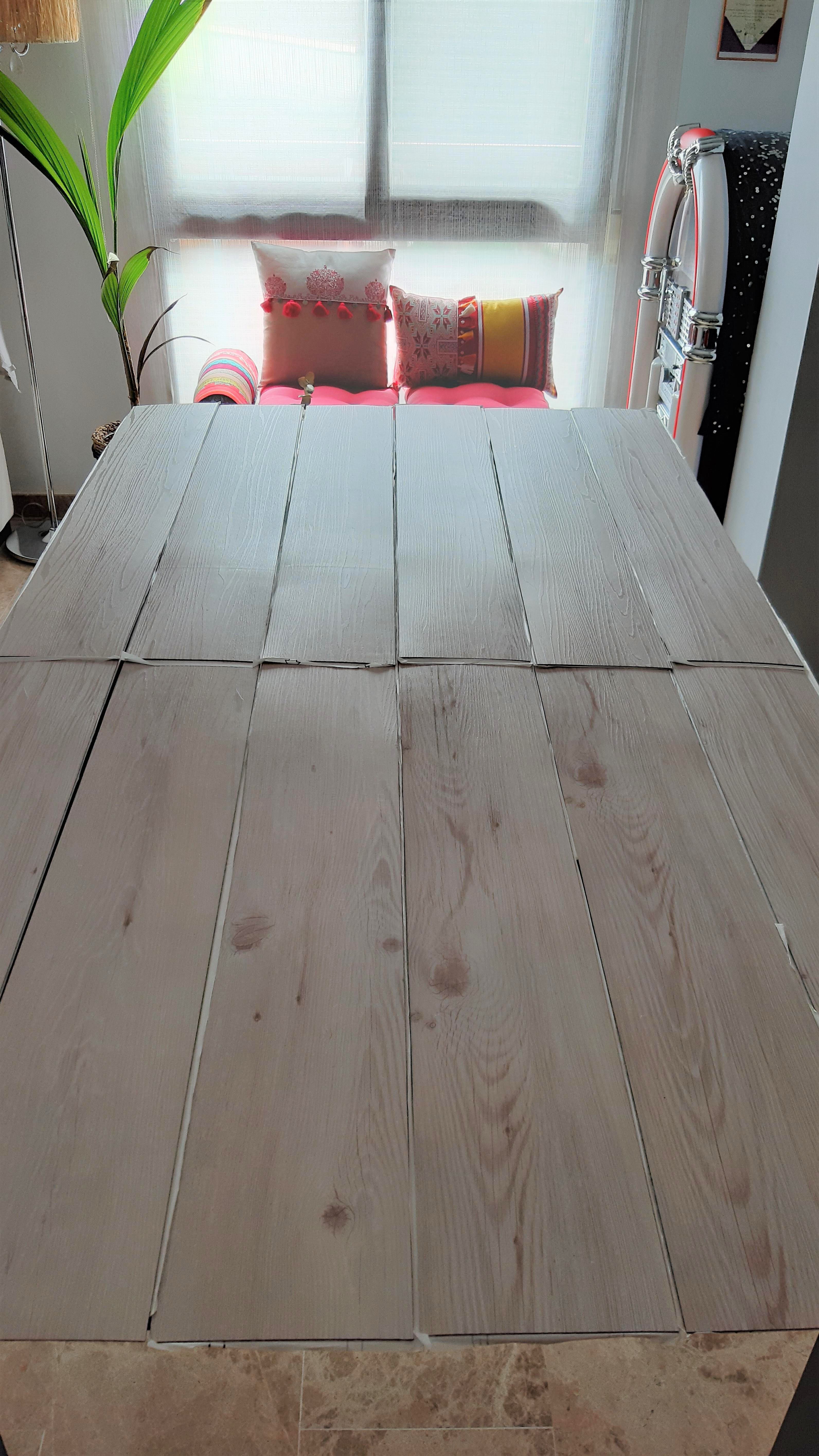Así que mi cabecita se puso a pensar y se me ocurrió que podía intentar simular ese efecto en mi mesa actual, poniendo unas lamas de vinilo que imitan madera.
