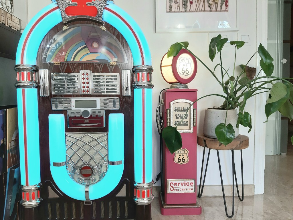 En mi casa tengo un rinconcito que es de lo mas vintage-industrial, con la jukebox, la lámpara guarda cds de la ruta 66, acompañadas la monstera en maceta de cemento y soporte de madera y hierro.
