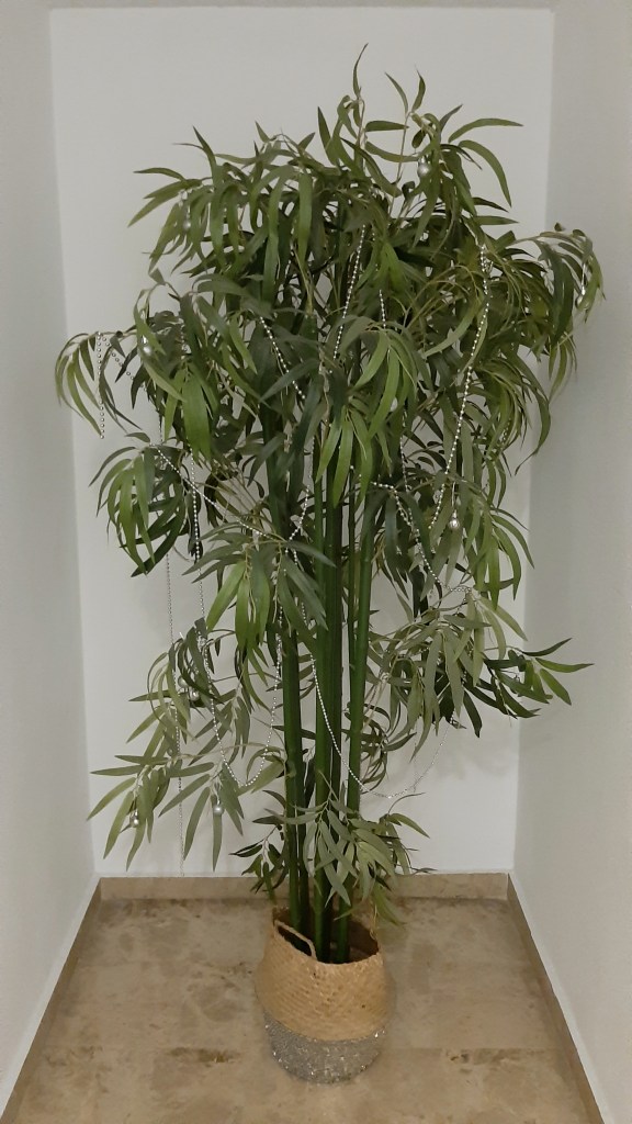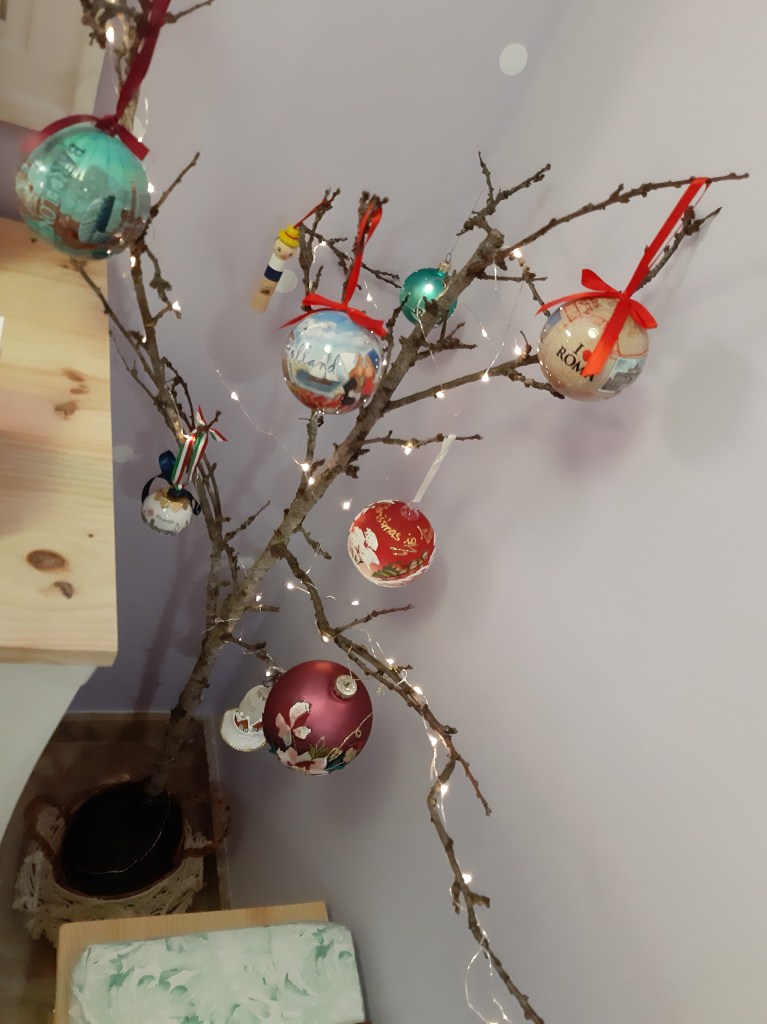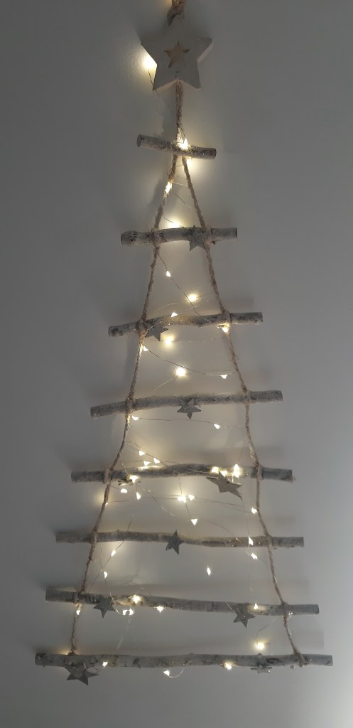 En el pasillo un arbolito hecho de ramas y en la entrada al salón he puesto la guirnalda que tengo todo el año sobre la chimenea.