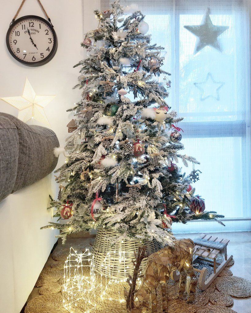 El árbol de navidad nevado con luces led incorporadas, reno luminoso y alguna bola, de El Corte Inglés; alfombra de yute, base del árbol, trineo y colgantes vichy, de Westwing; regalos luminosos, de A Loja do Gato Preto; colgantes del árbol de Maisons du Monde, Zara Home, y hechos a mano.