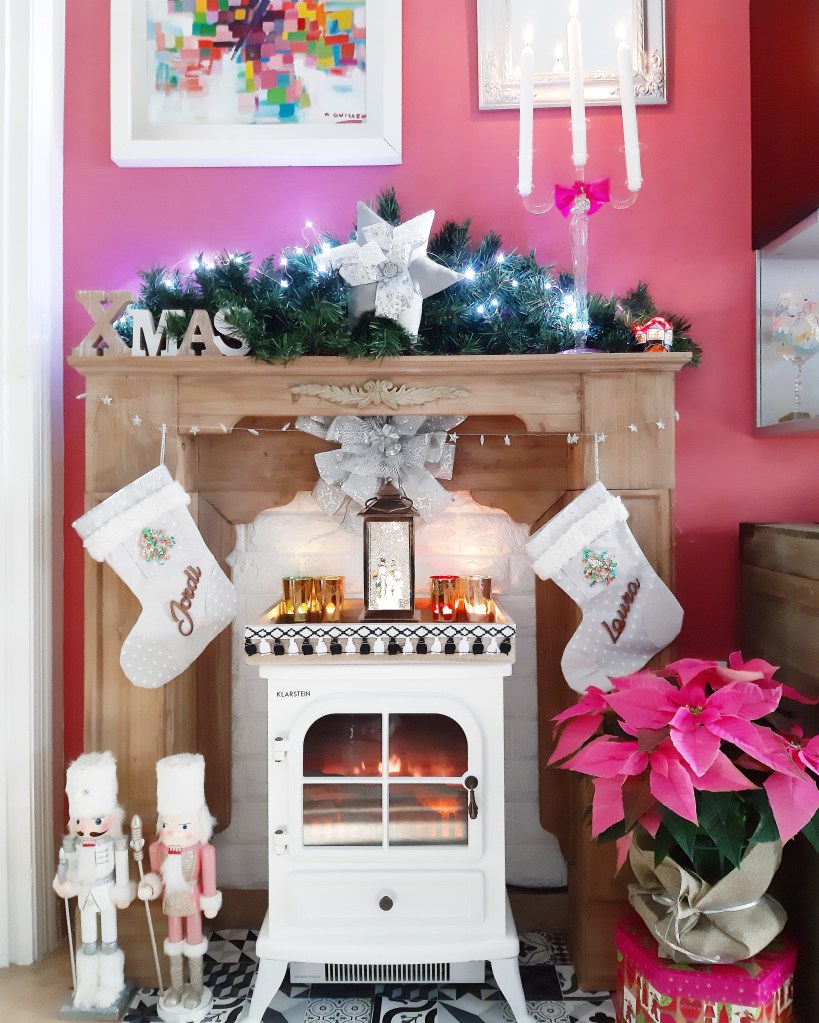 El marco de chimenea, la bandeja, el farolillo y el pino, de Westwing; la chimenea eléctrica, de Amazon; el candelabro de cristal, XMAS y el cascanueces blanco, de El Corte Ingles; las estrellas y lazos de tela y los calcetines, los ha hecho mi madre.