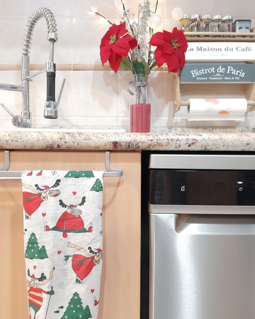 En la cocina algún detalle en rojo (la única estancia de mi casa donde queda bien este color tradicional navideño) y la pizarra.