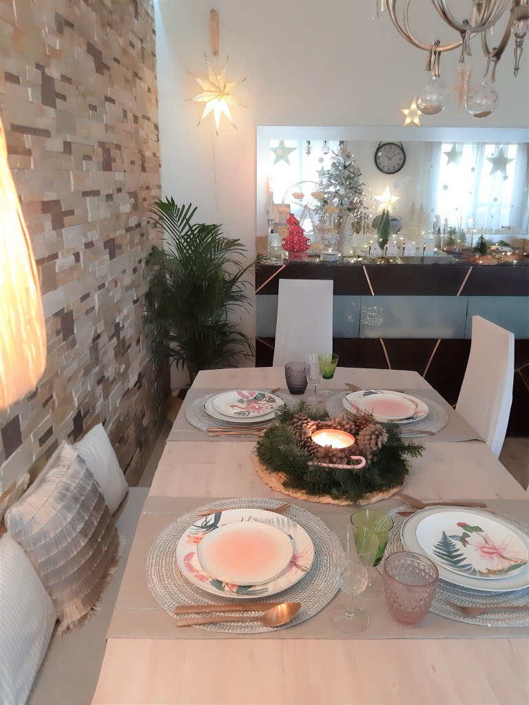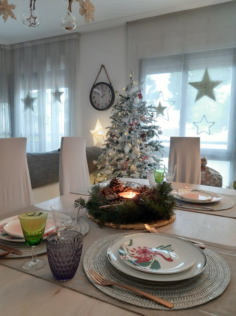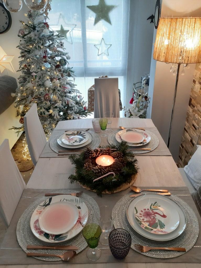 El centro de mesa lo he hecho yo con: un salvamantel y una corona de Ikea; piñas del campo; vela de Maisons du Monde.La lámpara estrella y los adornos que cuelgan de la lámpara, son de WestwingLa vajilla blanca y la estampada, son de El Corte Ingles; la cubertería de cobre y los platos rosas que parecen hechos a mano, de Westwing; camino de mesa y salvamanteles, de Maisons du Monde; y las copas, son antiguas.