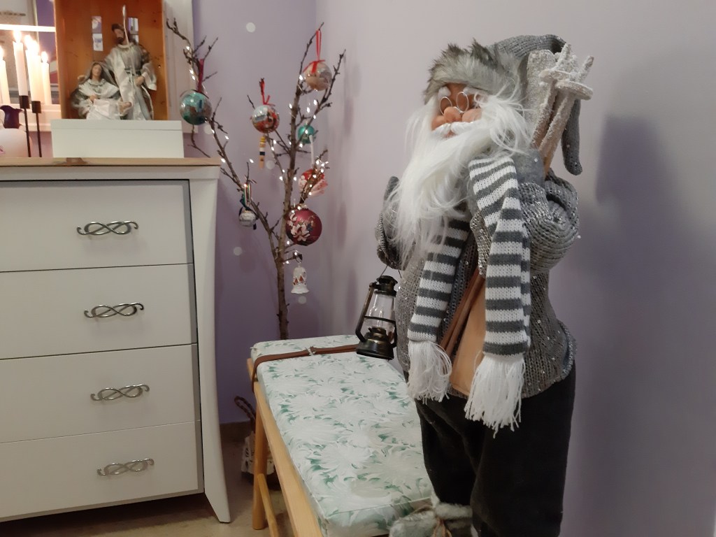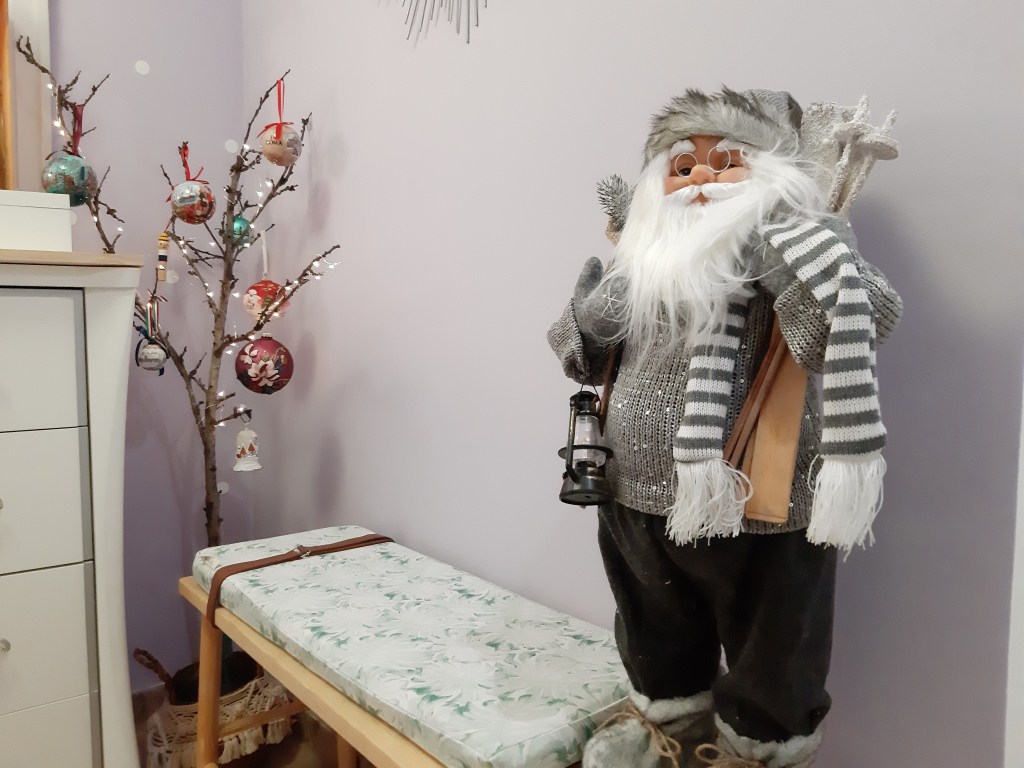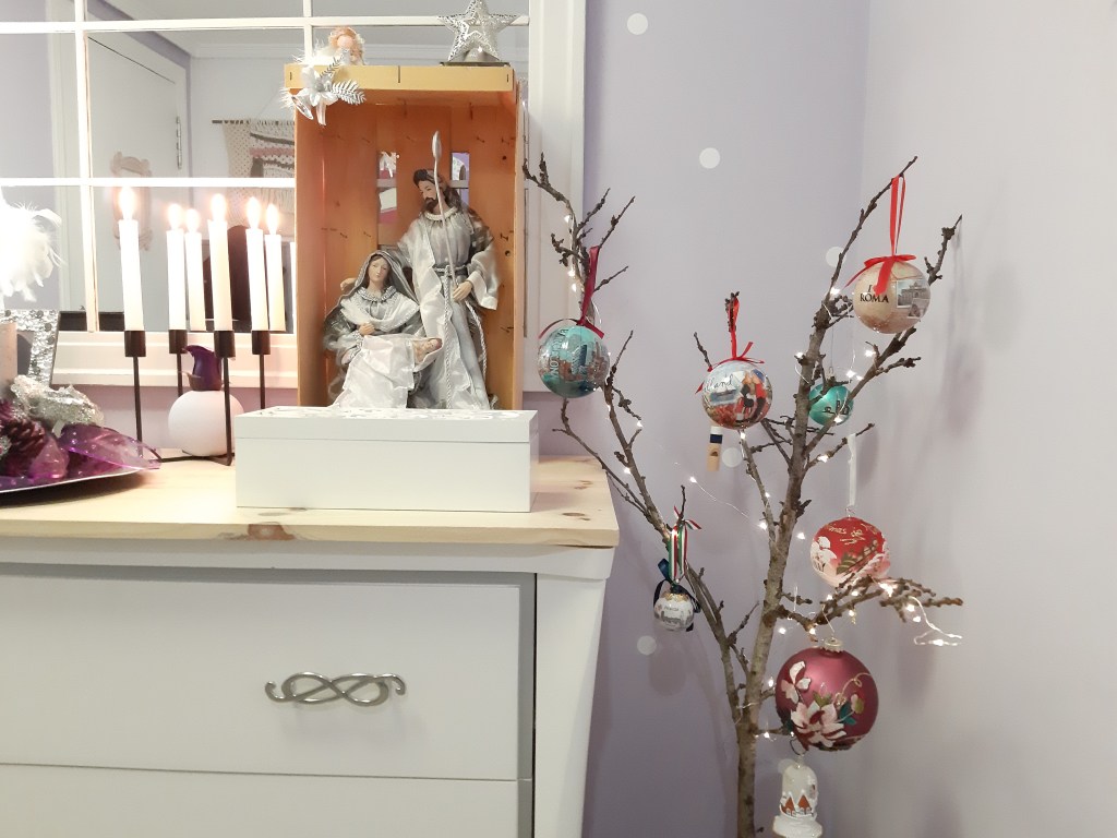 El recibidor lo preside un espejo ventana que también hice yo y, sobre él, una guirnalda que dejo todo el año. En el banco, mi Papa Noel precioso y en la esquina, una rama iluminada a modo de arbolito de donde cuelgan las bolas que hemos comprado en nuestros viajes navideños. Sobre la cómoda, el nacimiento en una caja de frutas y unas velas, completan el look navideño.