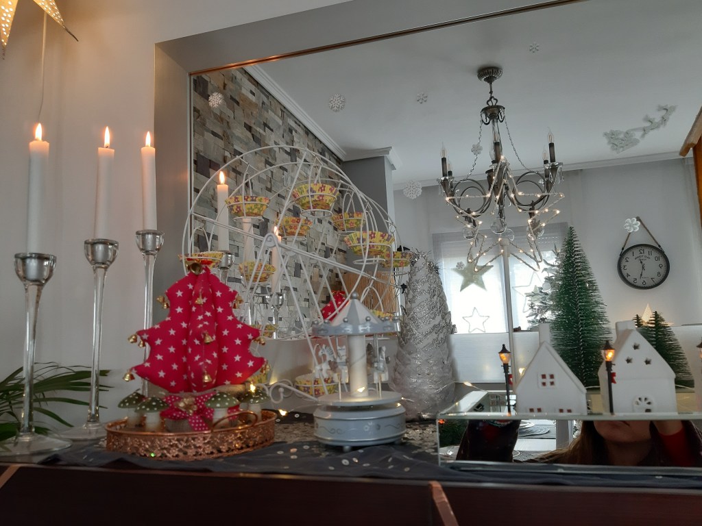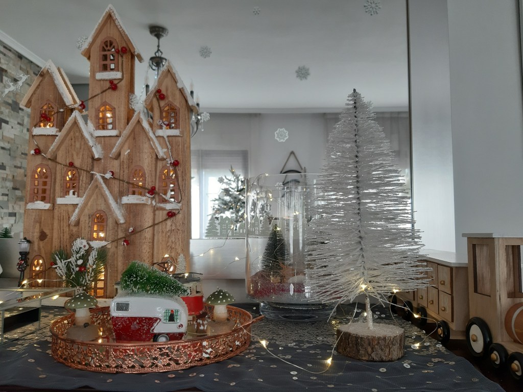 Las casitas luminosas de loza, son de Westwing; las farolitas y la iglesia, de El Corte Ingles; la bandeja espejo de Zara Home; el arbolito de la izquierda lo ha hecho mi madre; la estrella y el resto de arboles, de Ikea.El arbolito rosa, también lo ha hecho mi madre; los candelabros son de Ikea; la noria de Aliexpres; el tio vivo de Maisons du Monde.La carabana vintage, las velas seta y el árbol blanco, son de El Corte Ingles; el tren de madera que también es calendario de adviento, de Amazon; las pegatinas del espejo son de Maisons du Monde.