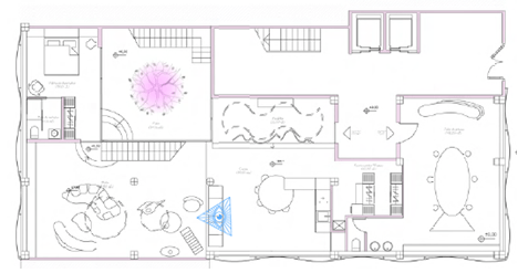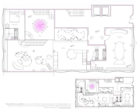 Una de las premisas del proyecto, es que se pudiera transformar en sala de exposiciones eventual. Para ello, se va a sectorizar la vivienda de la siguiente manera: al abrir la puerta principal, hará tope con un parabán de formas onduladas y que, junto con la puerta del patio interior, bloqueará el paso de los visitantes a la cocina y los guiará por este hacia el “estudio”, cuya puerta se abre hacia fuera, bloqueando así el acceso a las escaleras que suben a la zona privada. El recorrido continua por el salón y finaliza en la cocina que, gracias a su diseño, ocultará su función.