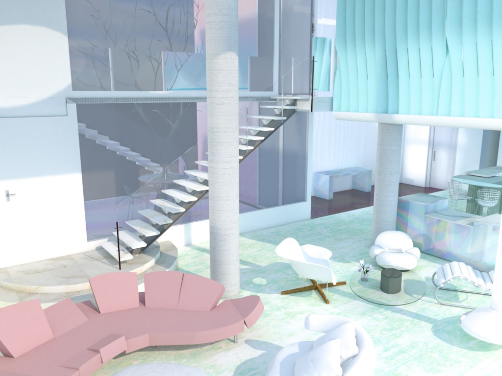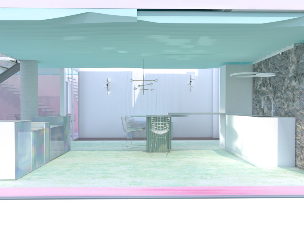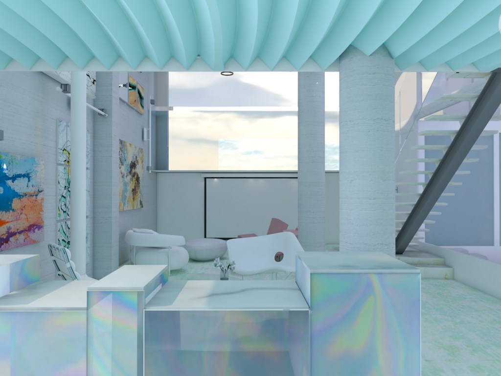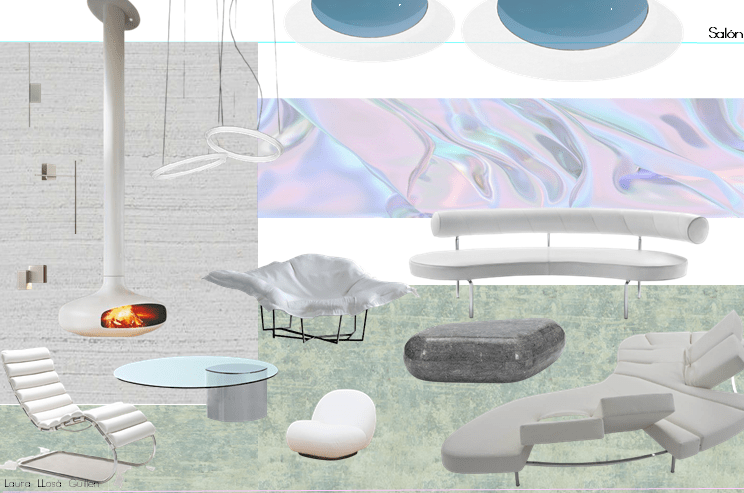 En el salón, sobre una base blanca, se colocará mobiliario tornasolado que cree efectos mágicos y momentos lumínicos irrepetibles.