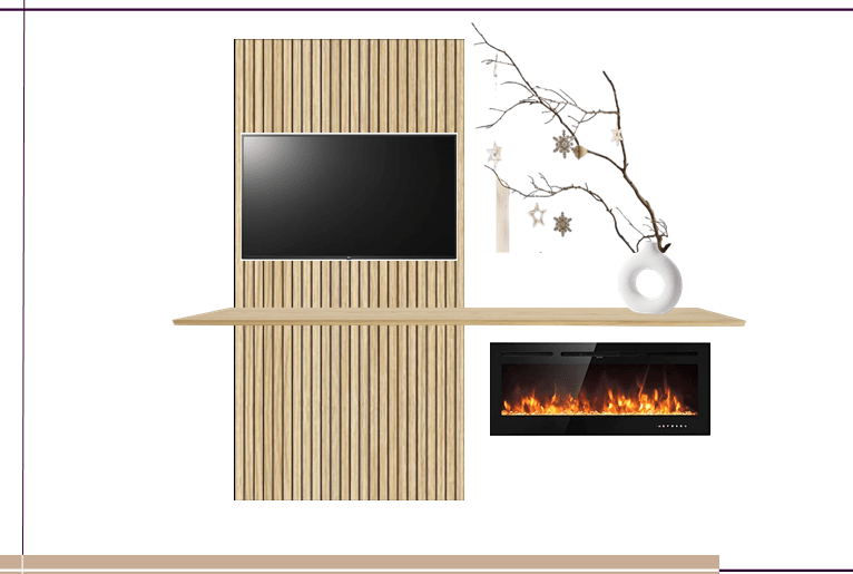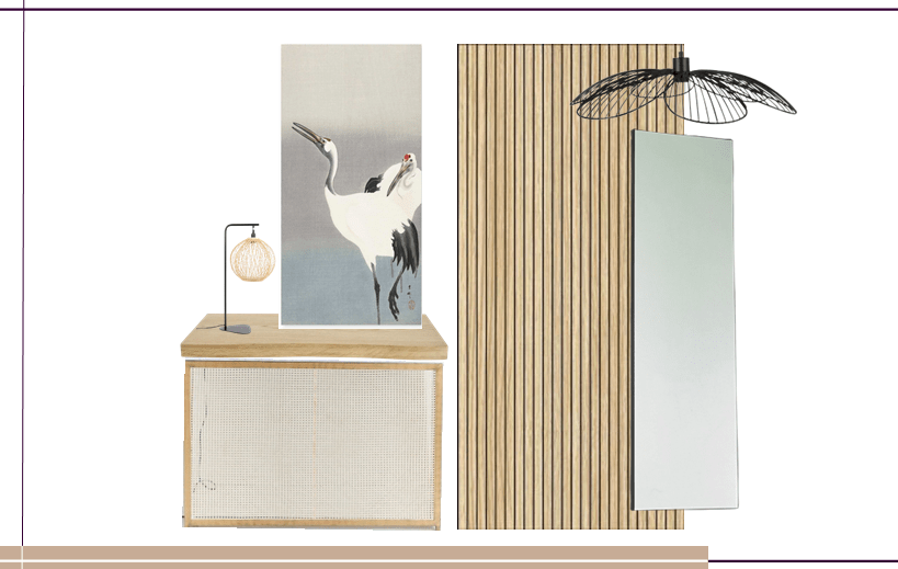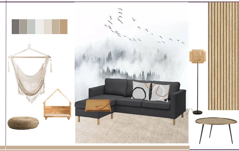 De cada uno de los alzados de la habitación, realizo un tablero de inspiración donde se visualiza el conjunto renovado con el mobiliario, textiles, papeles y luminarias reales.