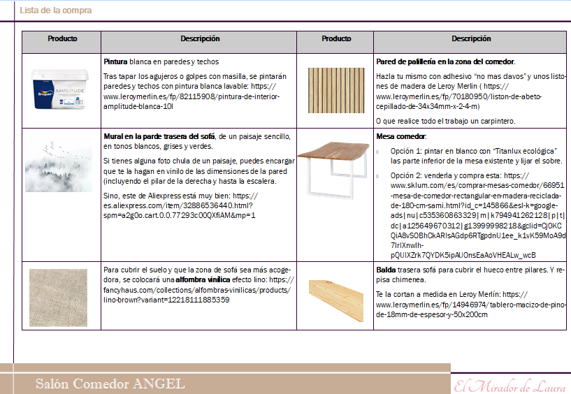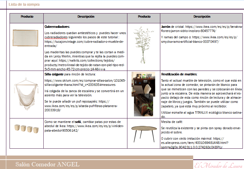 Por último, adjunto un listado detallado con cada uno de los elementos del diseño y los enlaces a la tienda online donde puedes adquirirlos. Además, te propongo en muchos casos reutilizar algunos muebles u objetos decorativos y la manera de hacerlo tu mism@.