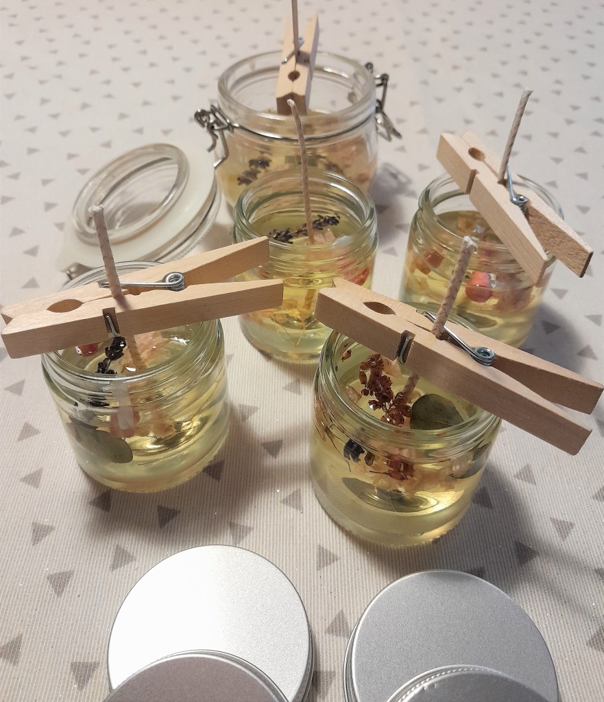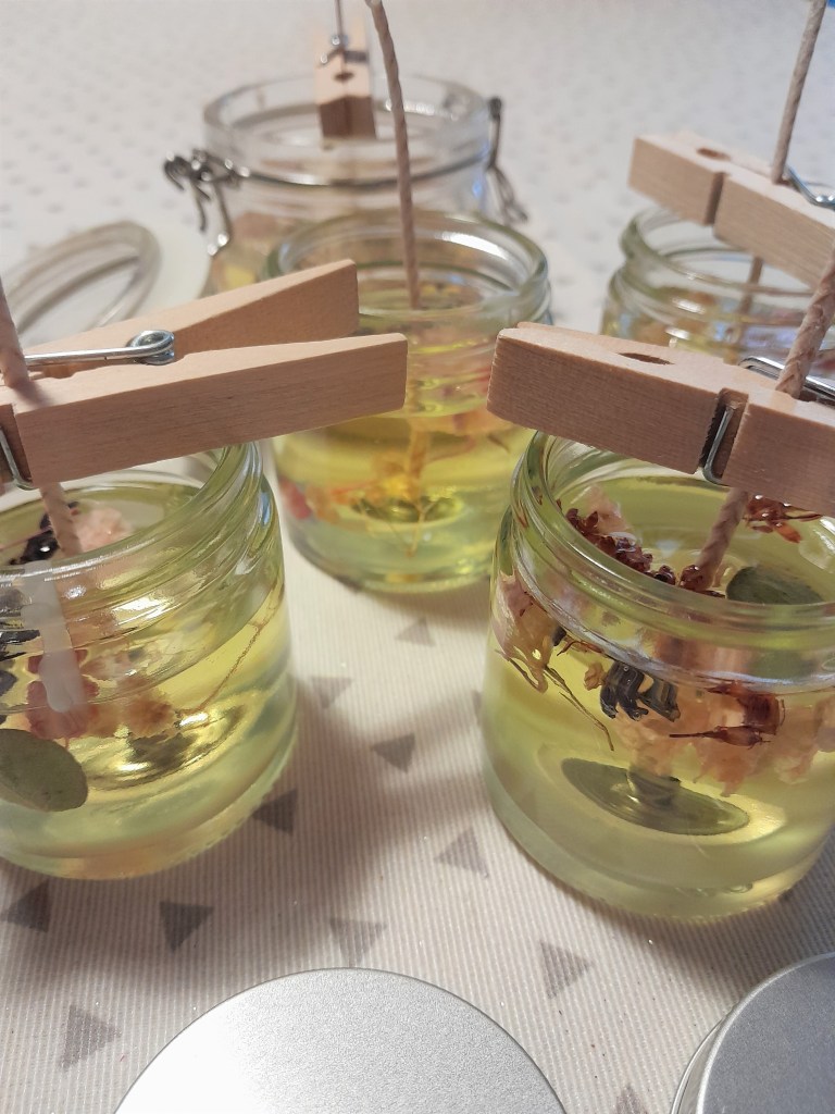 - Verter la mezcla en el envase elegido para las velas. En este paso, he ido introduciendo florecillas secas.
